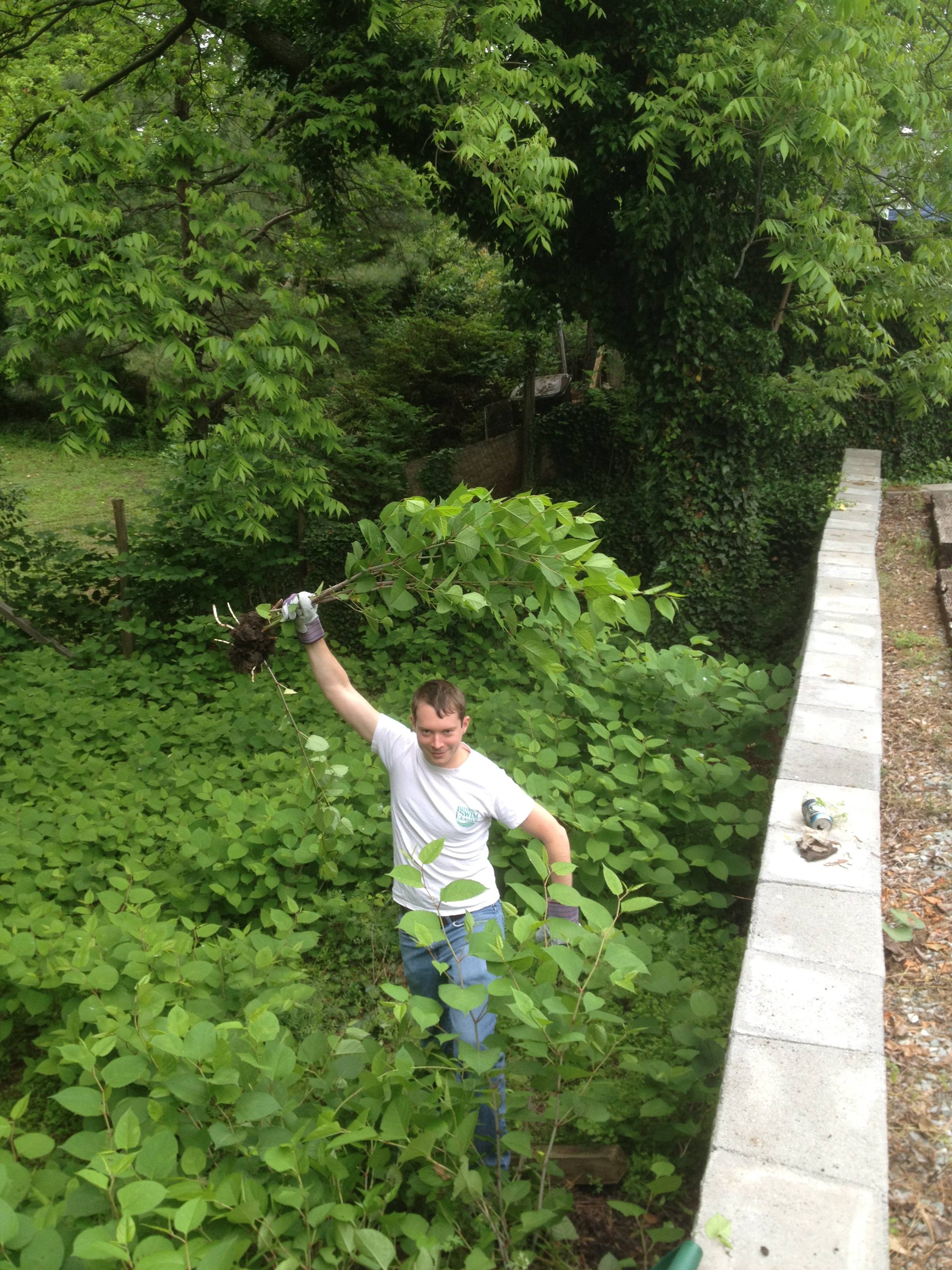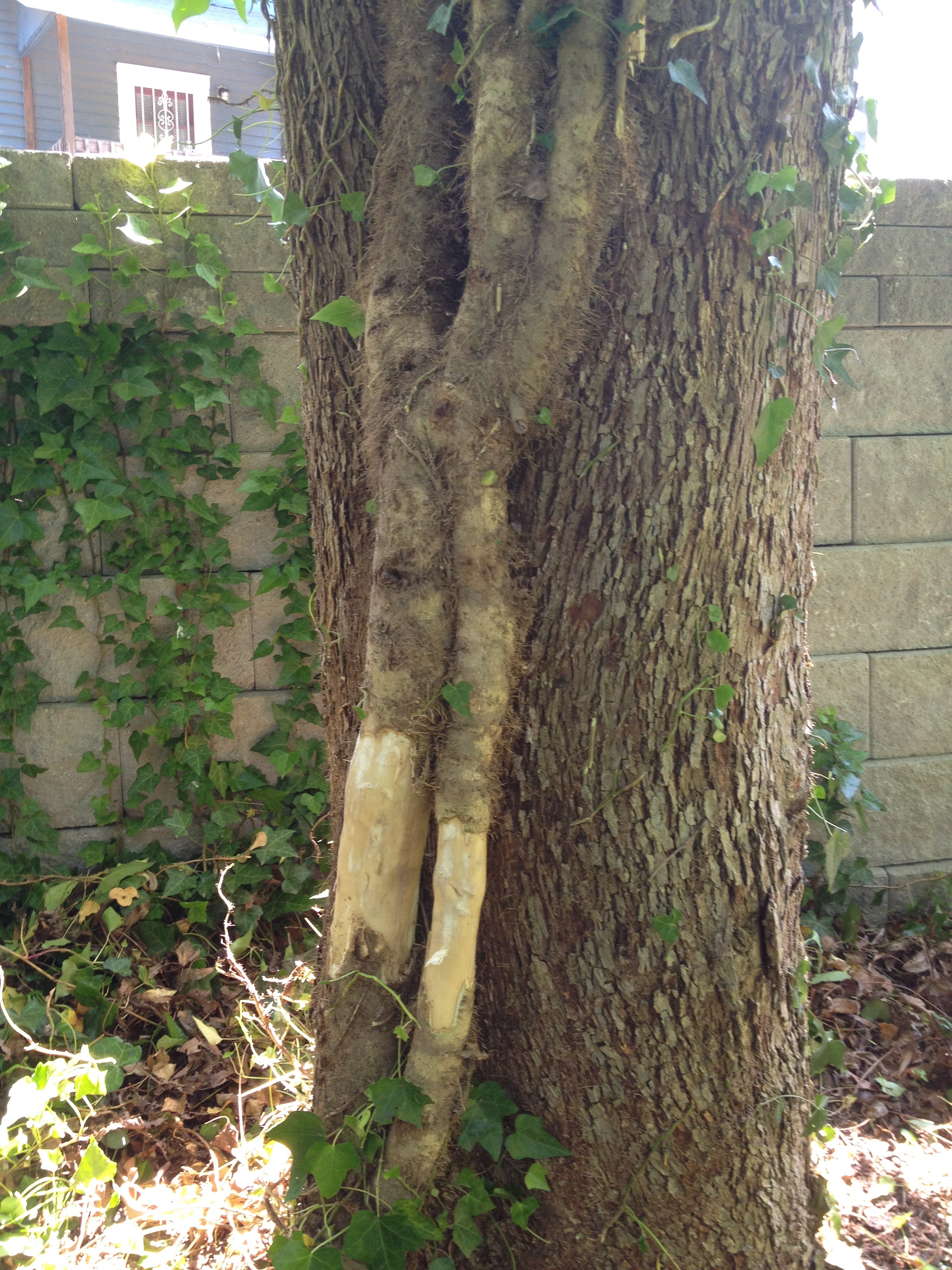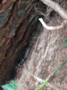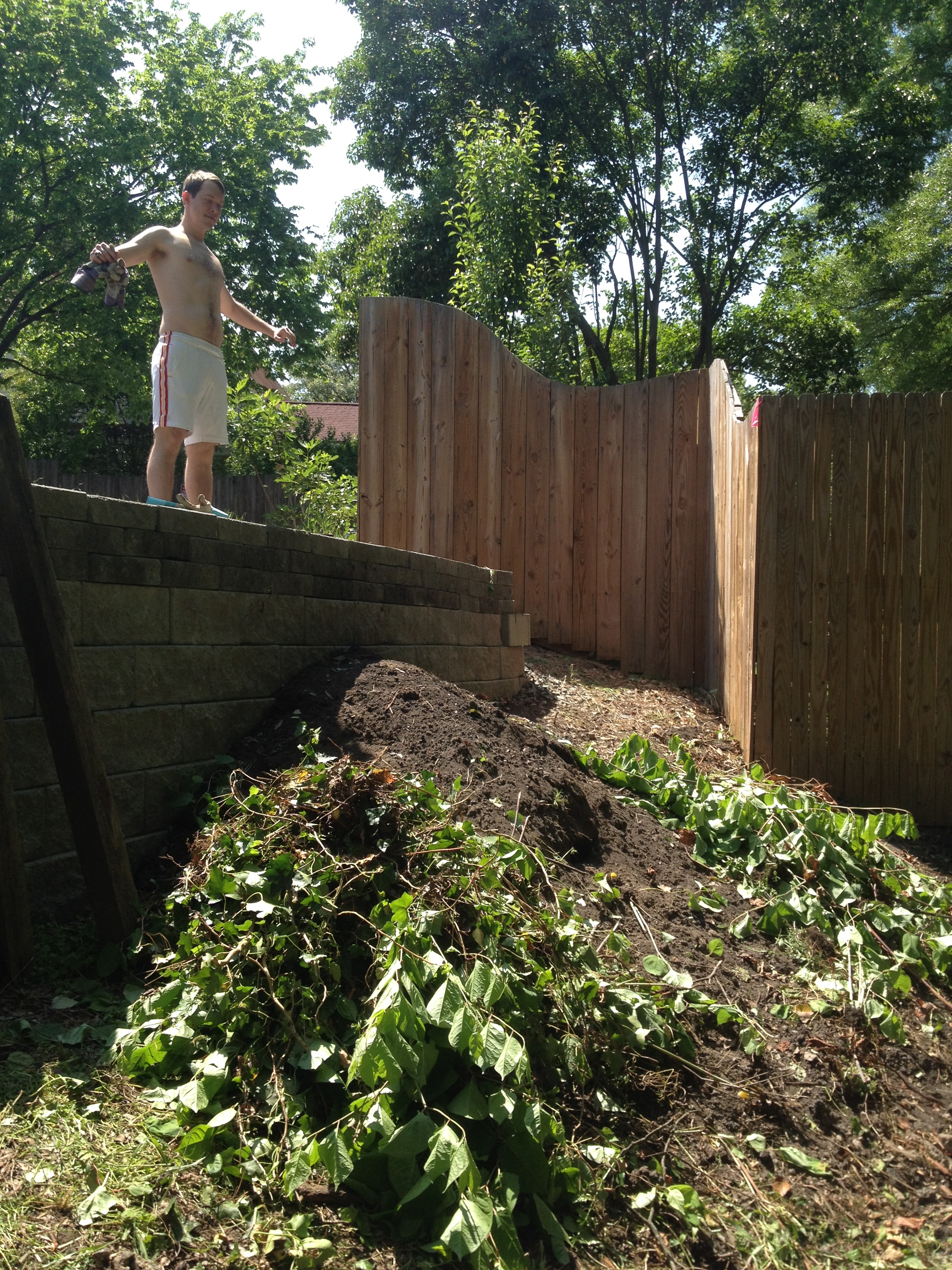 Definitely the most exciting discovery was the pecan tree. Yesterday I though the leaves looked like pecan but today we found bunches of rotten pecans as we cleared under the tree. Jackpot. You can see Chris cleared the ivy to about shoulder height but he didn’t have the right tools to take out the trunk. Who knew ivy could get that thick? He stripped some of the bark in an attempt to kill it, and we’ll have to come back with a hatchet or axe.