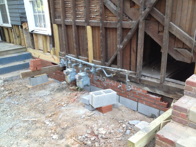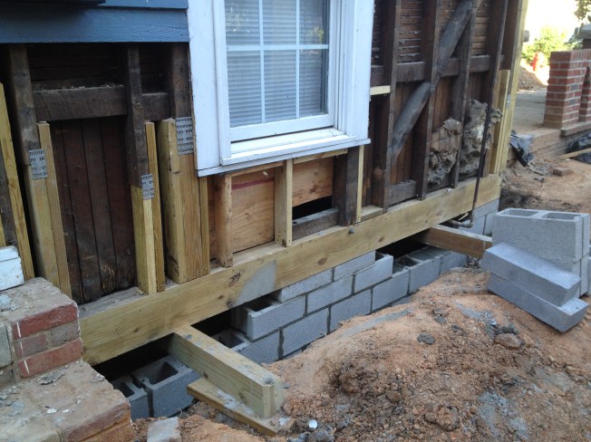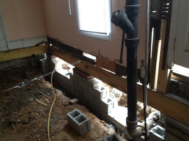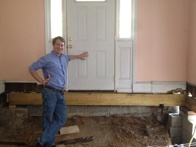 Can you see it? There is a layer of bricks sitting on the cinderblock that wasn’t there in the first 2 pictures. They raised the house 3 inches on this side. Chris is posing to show how level the support beam under the door is, unfortunately my camera was not level so it doesn’t look good at all. In person it’s looks quite level and is a huge improvement over the slant we had before!