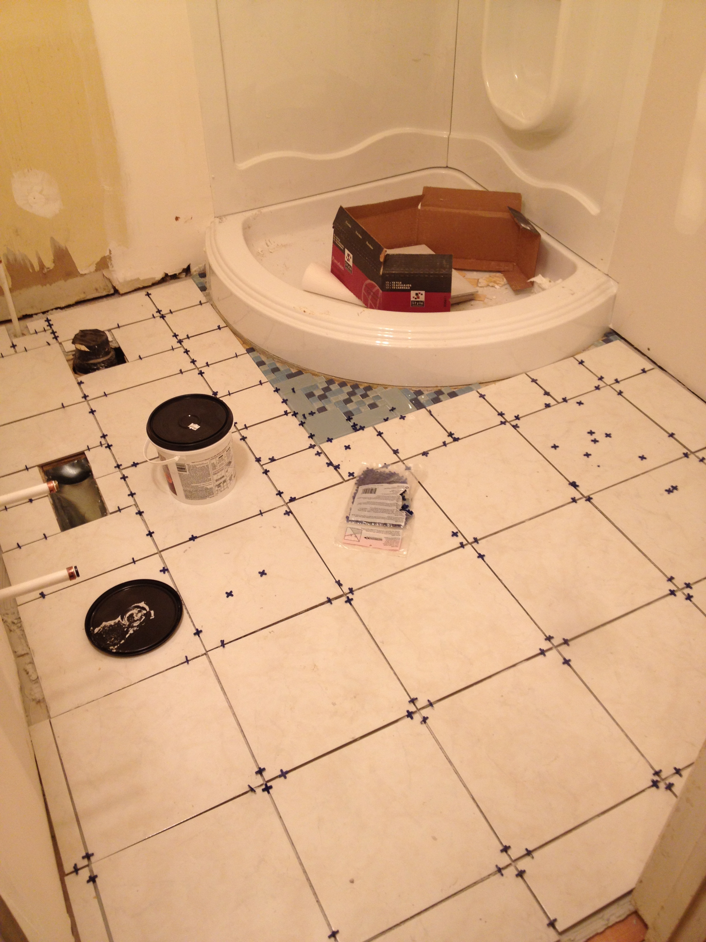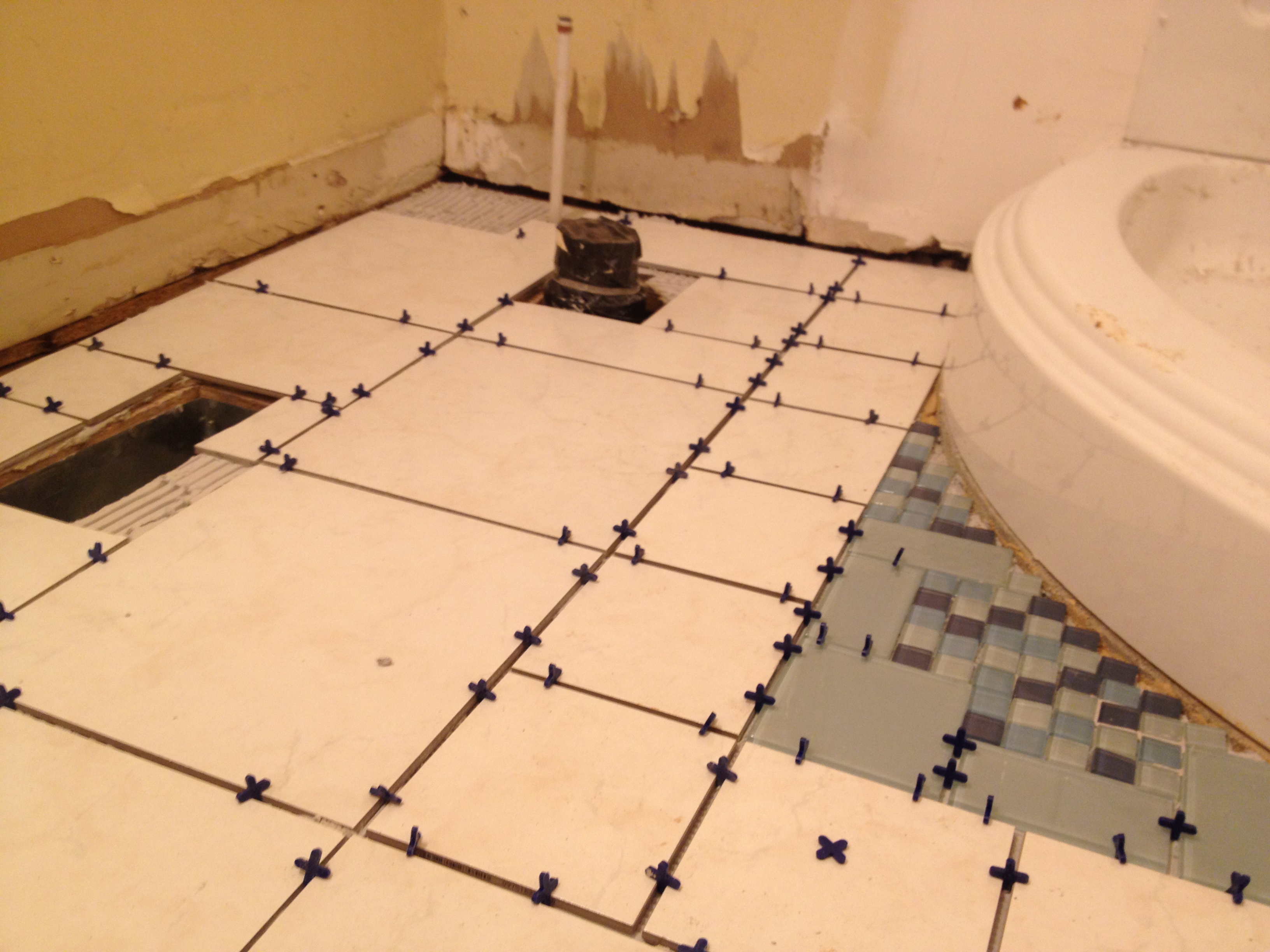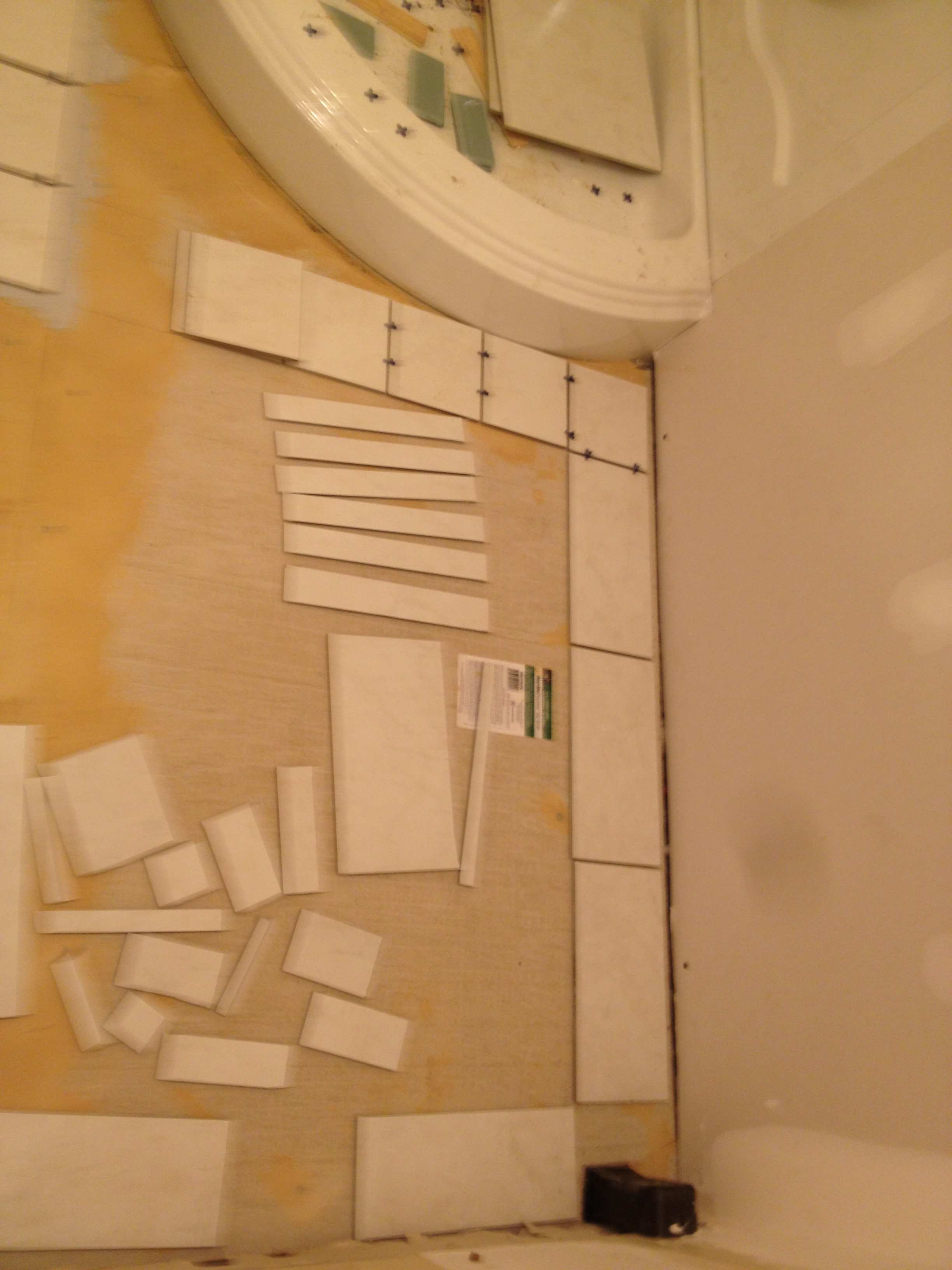 So tiling this bathroom was our first real DIY project and all the satisfaction that goes with that. We measured our tiles and then got them cut at Lowes (fo free!)
