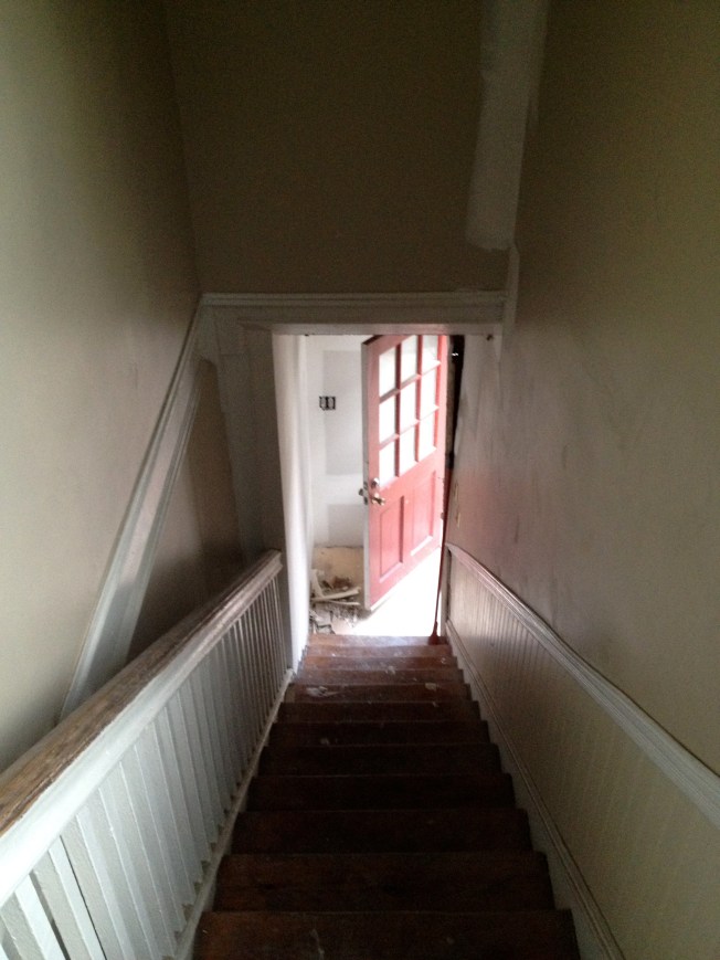 This bathroom, in the back of the house on the first floor was one of the most awkward areas in the house. You can see that the shower came out of a wall built in the middle of the room leaving a little alcove between the entrance wall and the tub. But what can you do with a 5’8″ x7’2″ space?