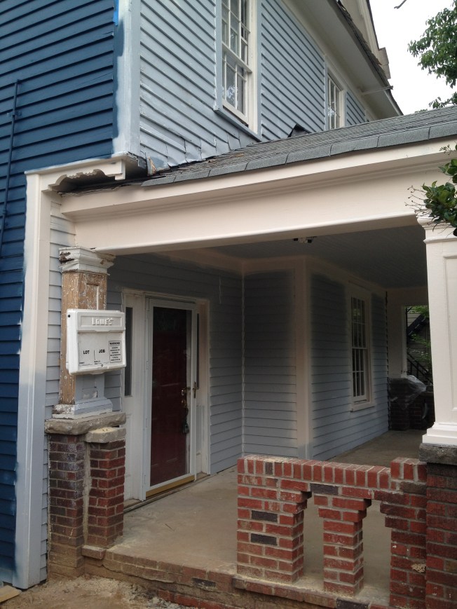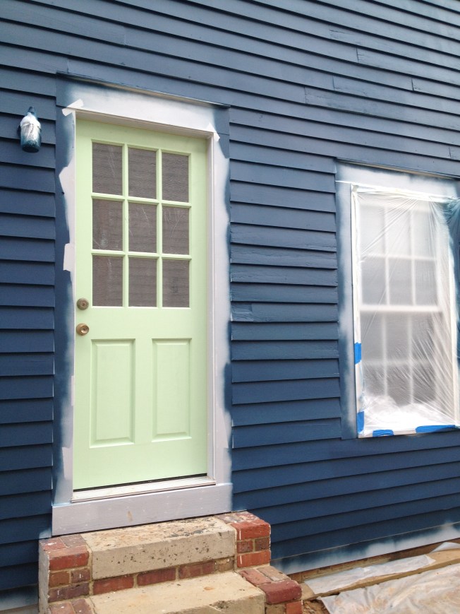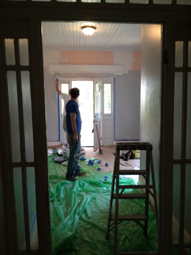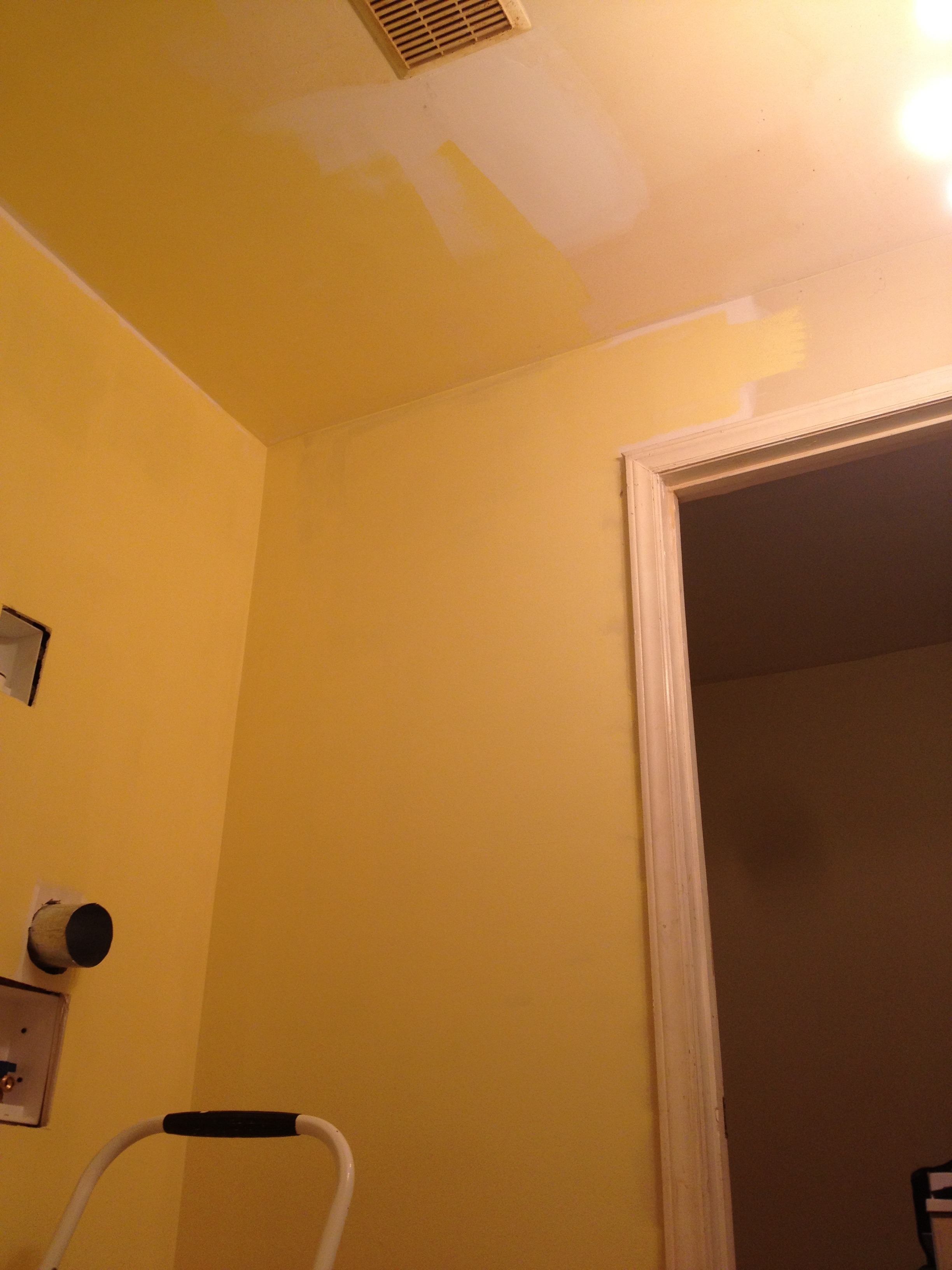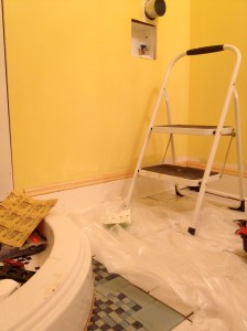 The yellow we picked out is one of the historic colors Valspar does, based on the Homestead Resort where we spent part of our honeymoon. I’m going to have to replace the light in here with something whiter, but I’m really quite pleased. We painted before the grout since we’ve heard it is easier to clean paint off the tile then the grout.