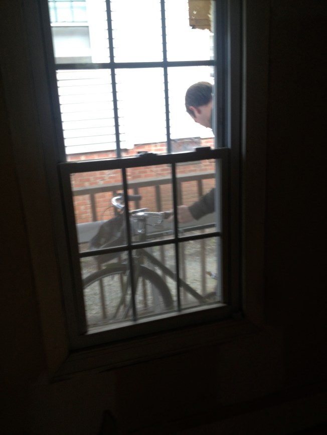 Chris taking his new bike to church. We’re going to keep it inside, in our bedroom actually, and I have lots of ideas on how to make a little spot for it.