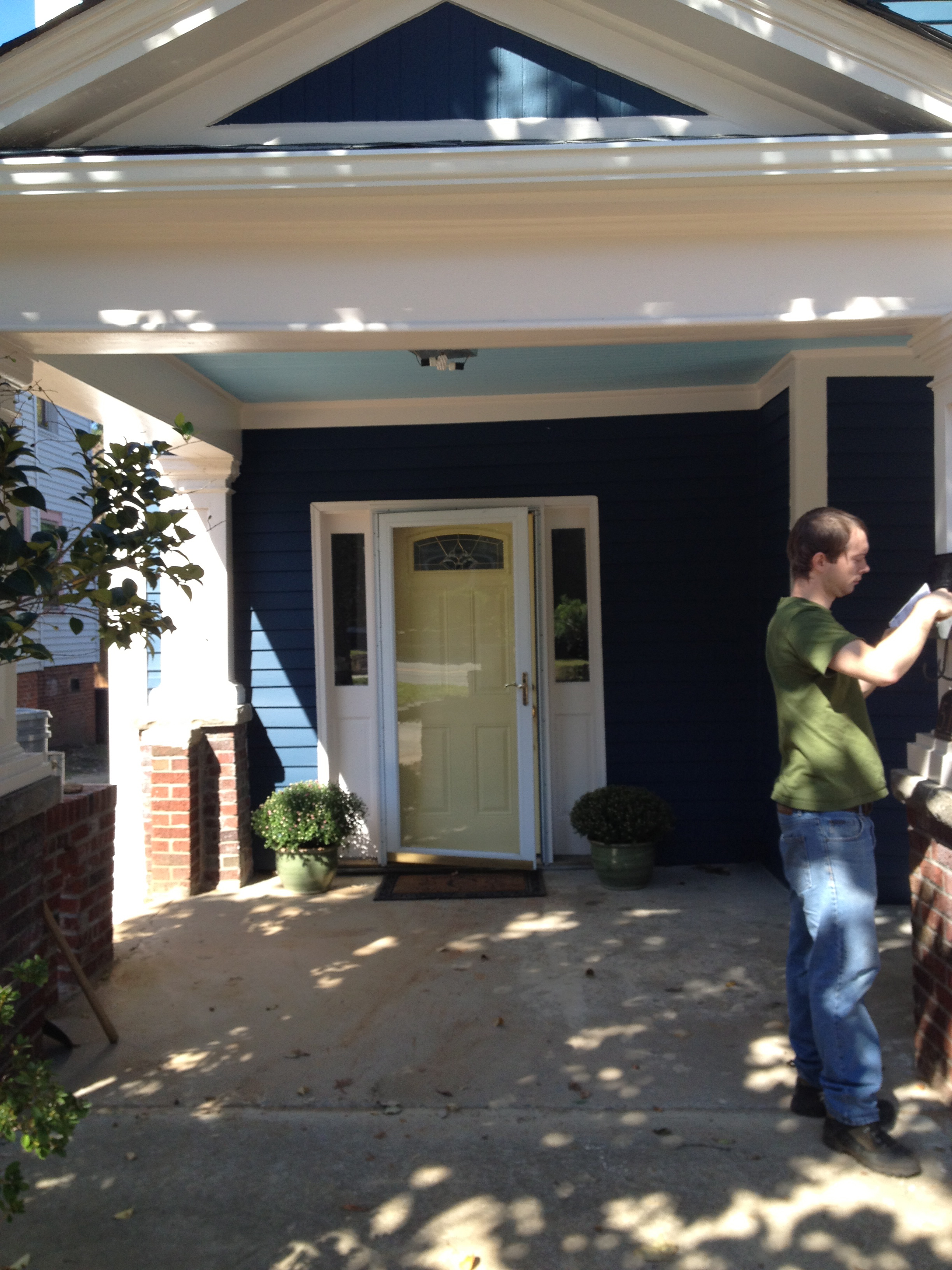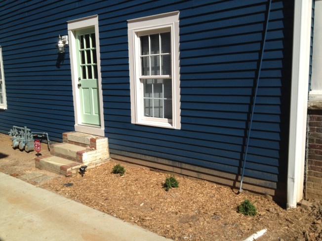 Plant azaleas on the side and mulch (but not enough since we ran out). Chris’s Dad also installed the light fixture you see, which is a motion detector which is only active at night. While he was in town he also got our motion activated flood lights out back to work and wired an outlet for our washing machine so we don’t have to use an extension cord anymore.