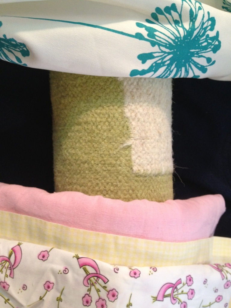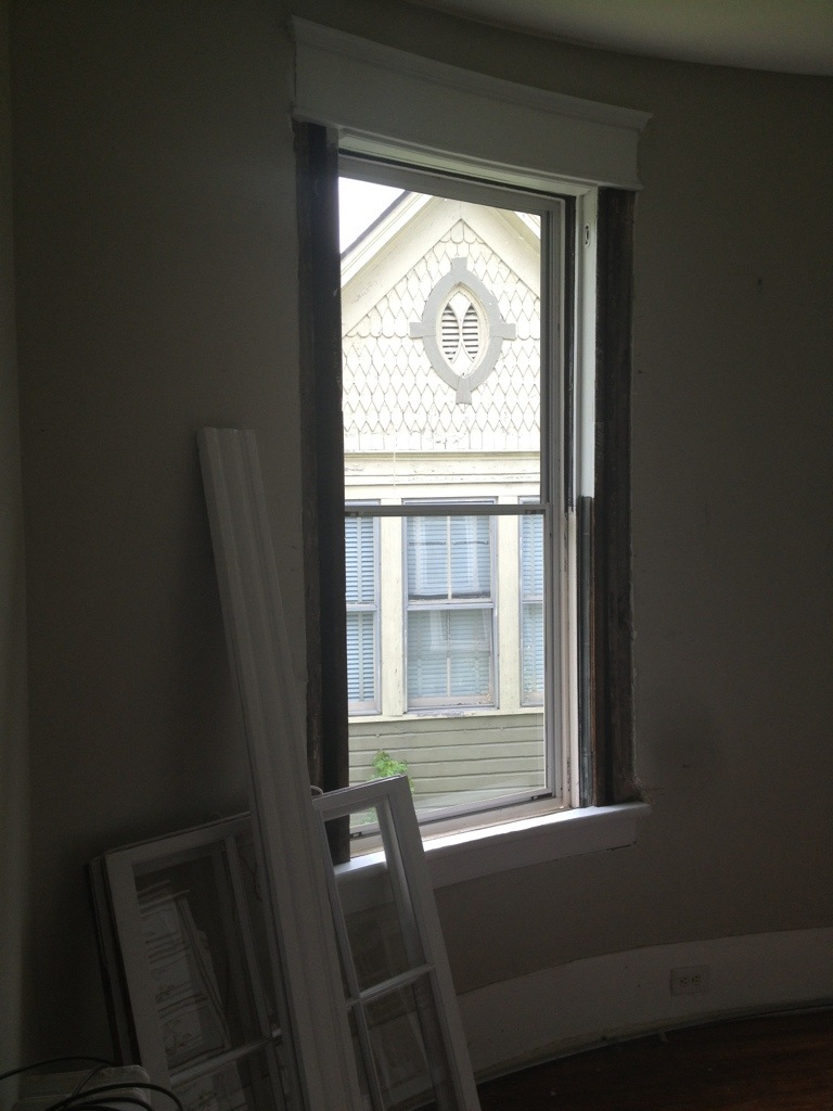 May4 More windows Posted on 2013-05-04 by magnetsfromeverywhere Standard The windows have been delivered but not yet reinstalled. I started working on curtains this morning at Mom’s but the room will have to be painted too before I hang them. The white with dandelion is the curtain material and the green is the rug.