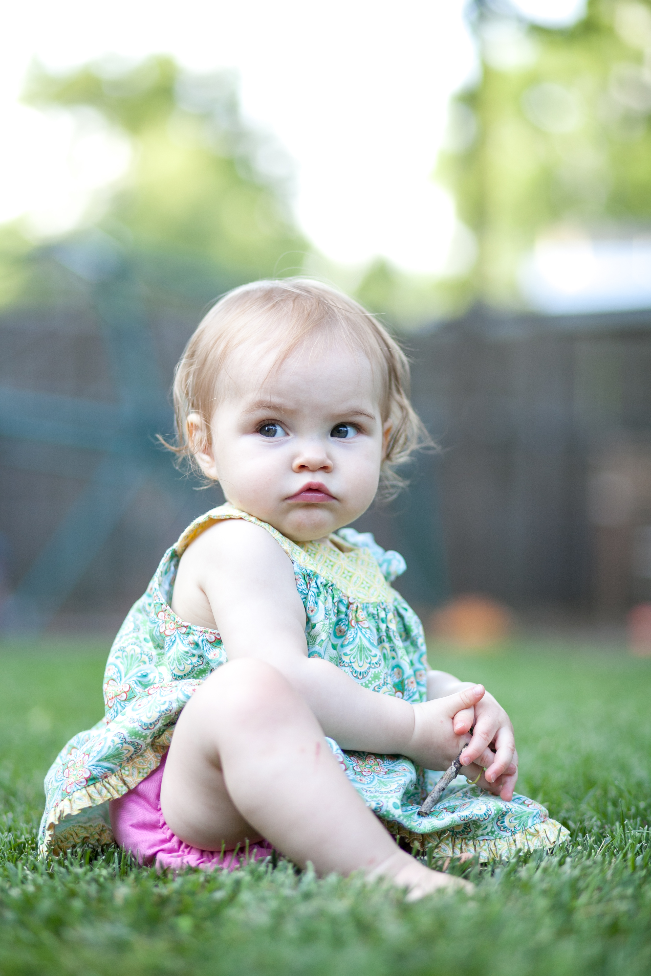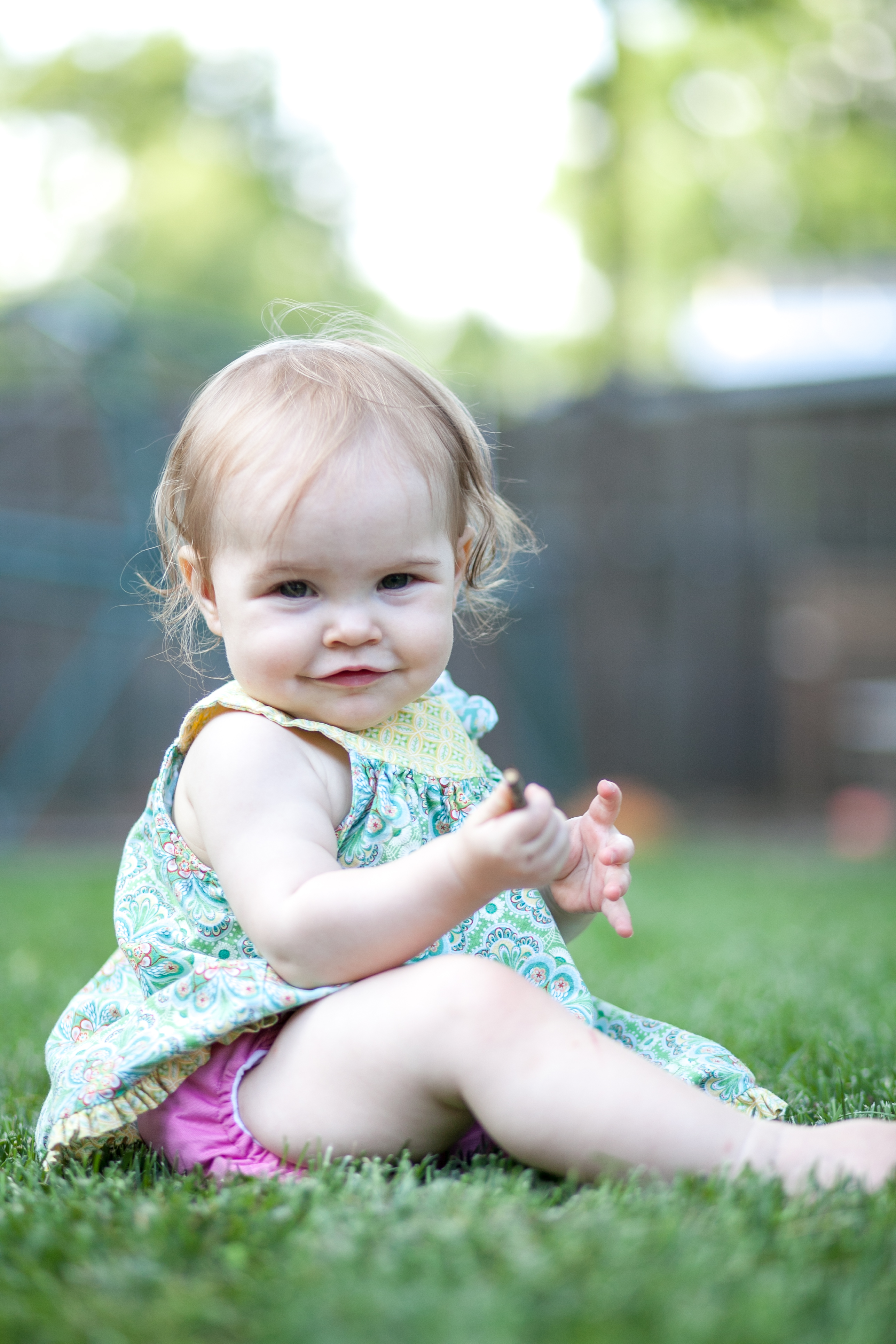 She says “Mama” and “Dadda” or “Dadee” a lot but so far we haven’t been able to definitely say that she’s directed them at one of us. She did stand up and look right at me the other day and said “Mama” but it still could have been a coincidence because she hasn’t done it again. Her other favorite thing to babble is “Babababa”.