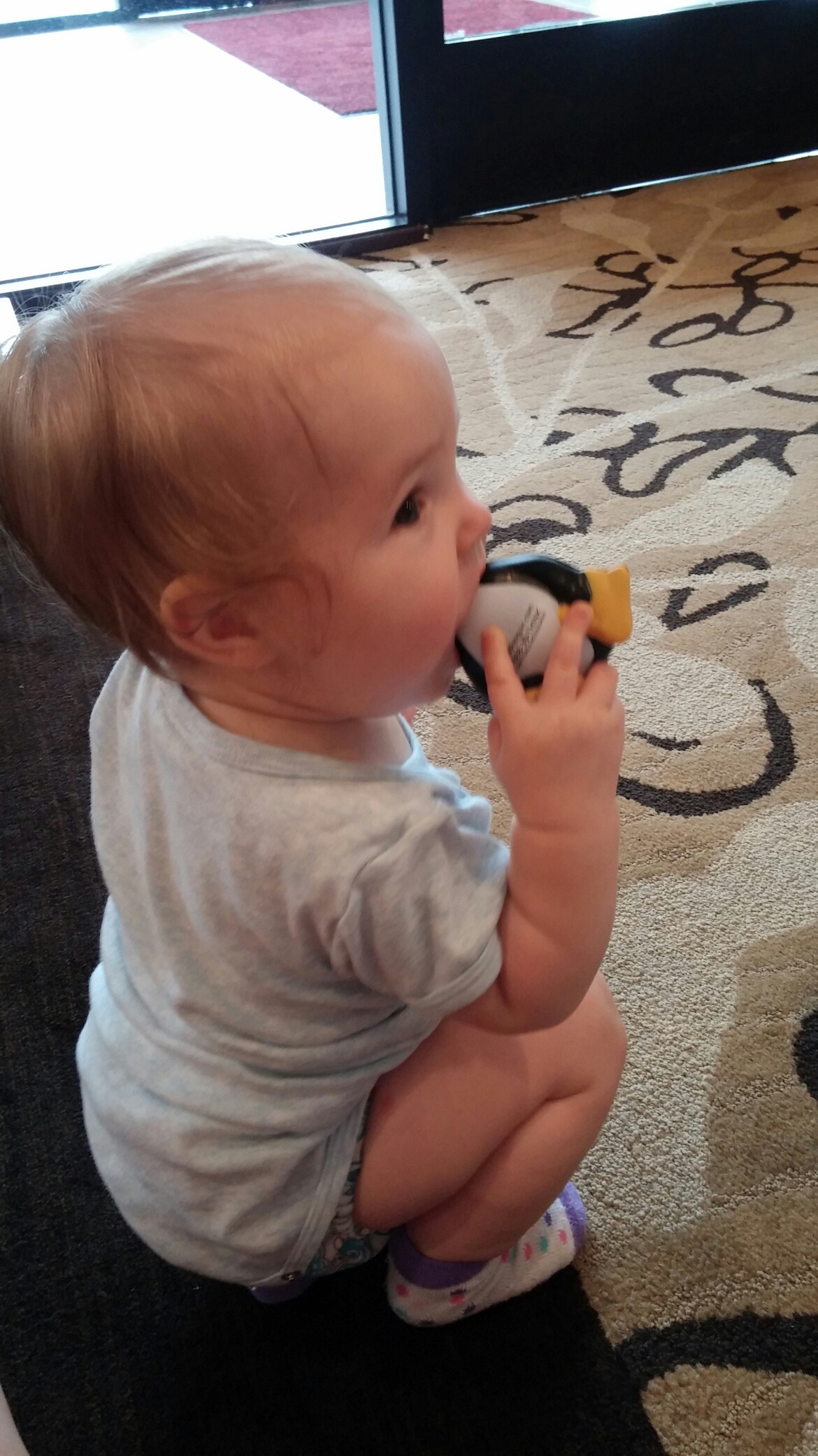 She has one tooth that finally just broke through after 2 weeks of struggle. We first noticed (Uncle Daniel noticed first) Friday June 13th and it finally emerged yesterday.