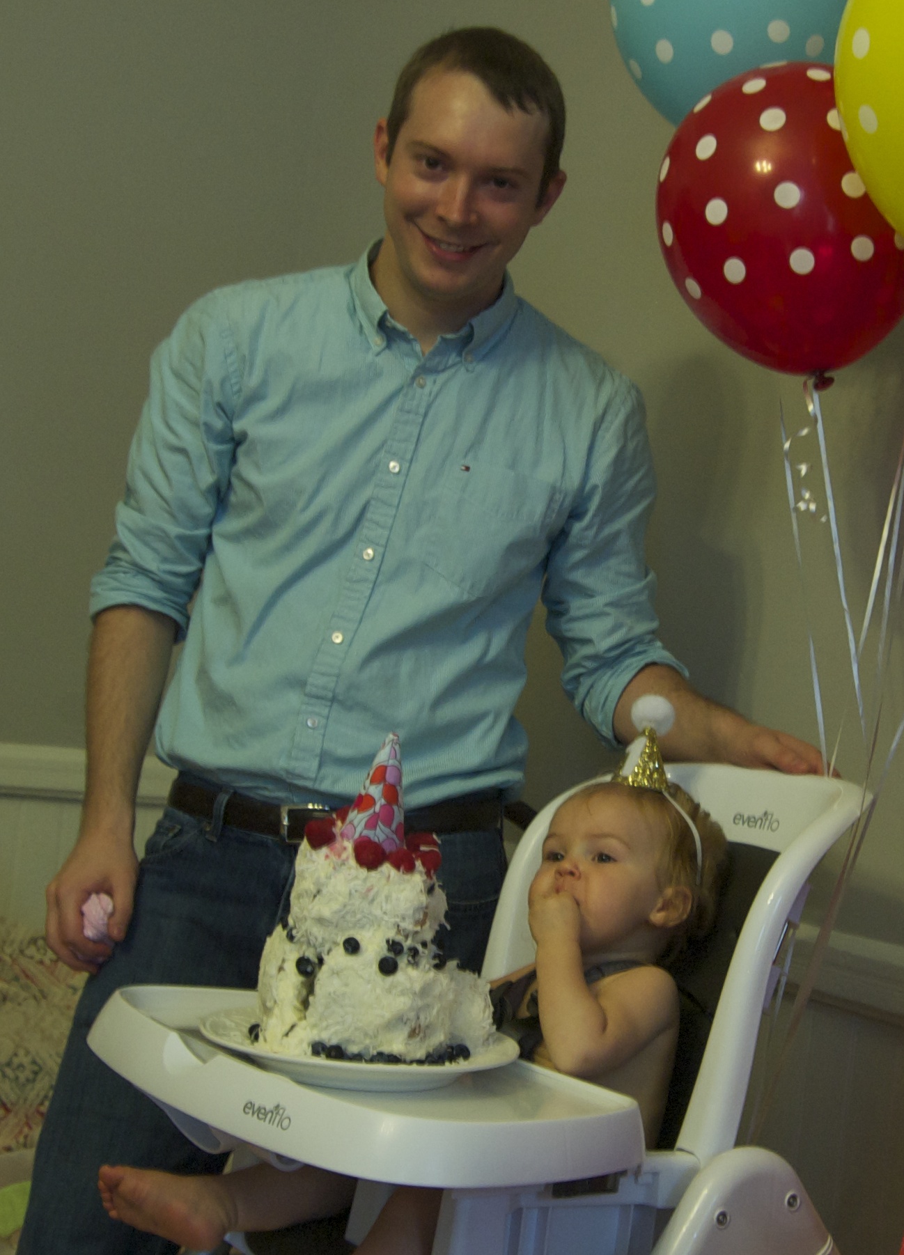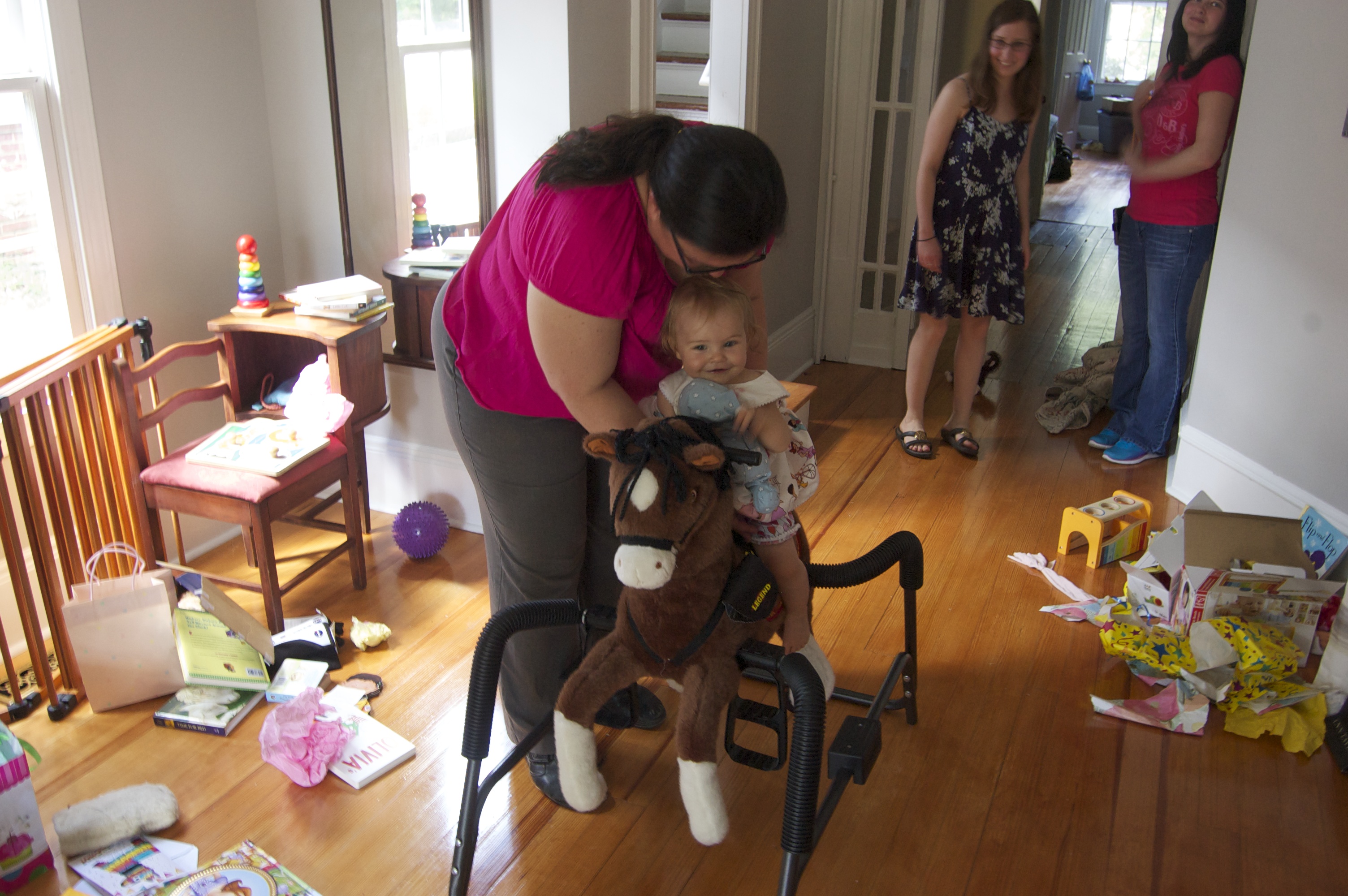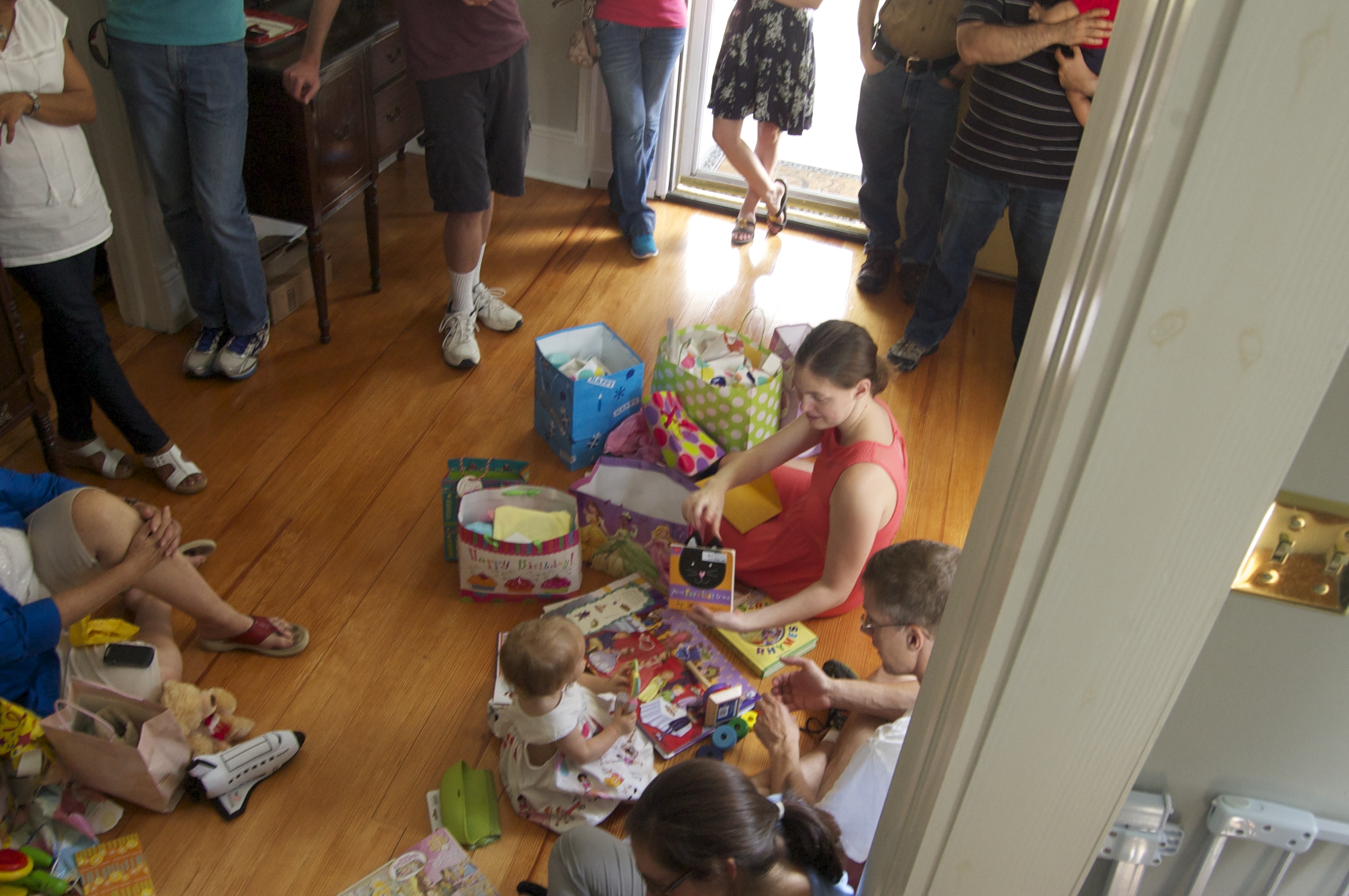 My Pampa took pictures today and they’re all on facebook as well. She had a great party with lots of family and friends. It was a bit chaotic and she was a bit overwhelmed by the whole thing but she took it in stride and kept smiling through the whole thing. She received a lot of presents and did not seem to understand the concept of opening them at all, but she happily went through her new toys giving each of them a shining 5 seconds of attention before turning to the next present. I decided the best route was not to linger on each present but to bulldoze through the rather large pile since everyone was gathered around standing to watch.