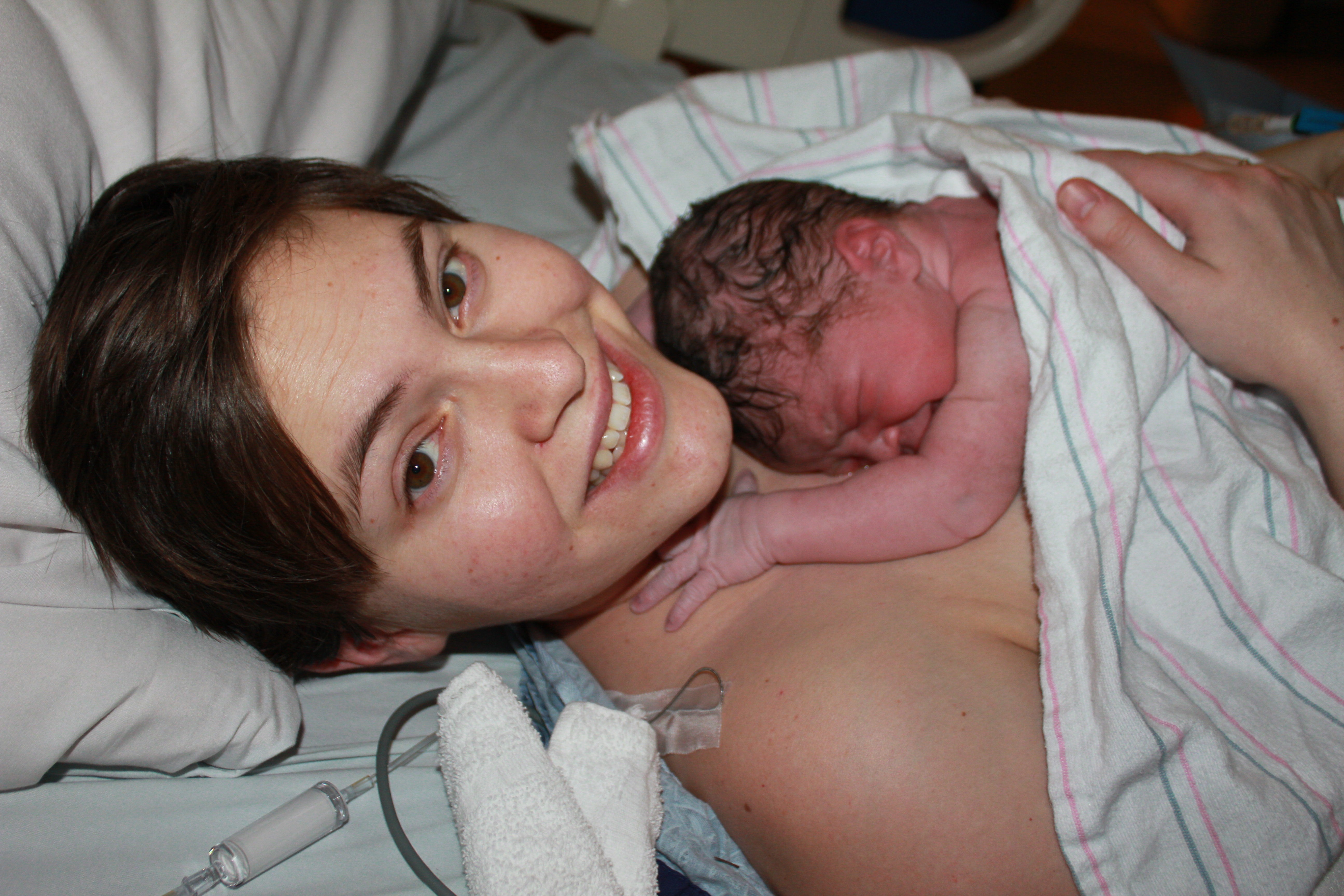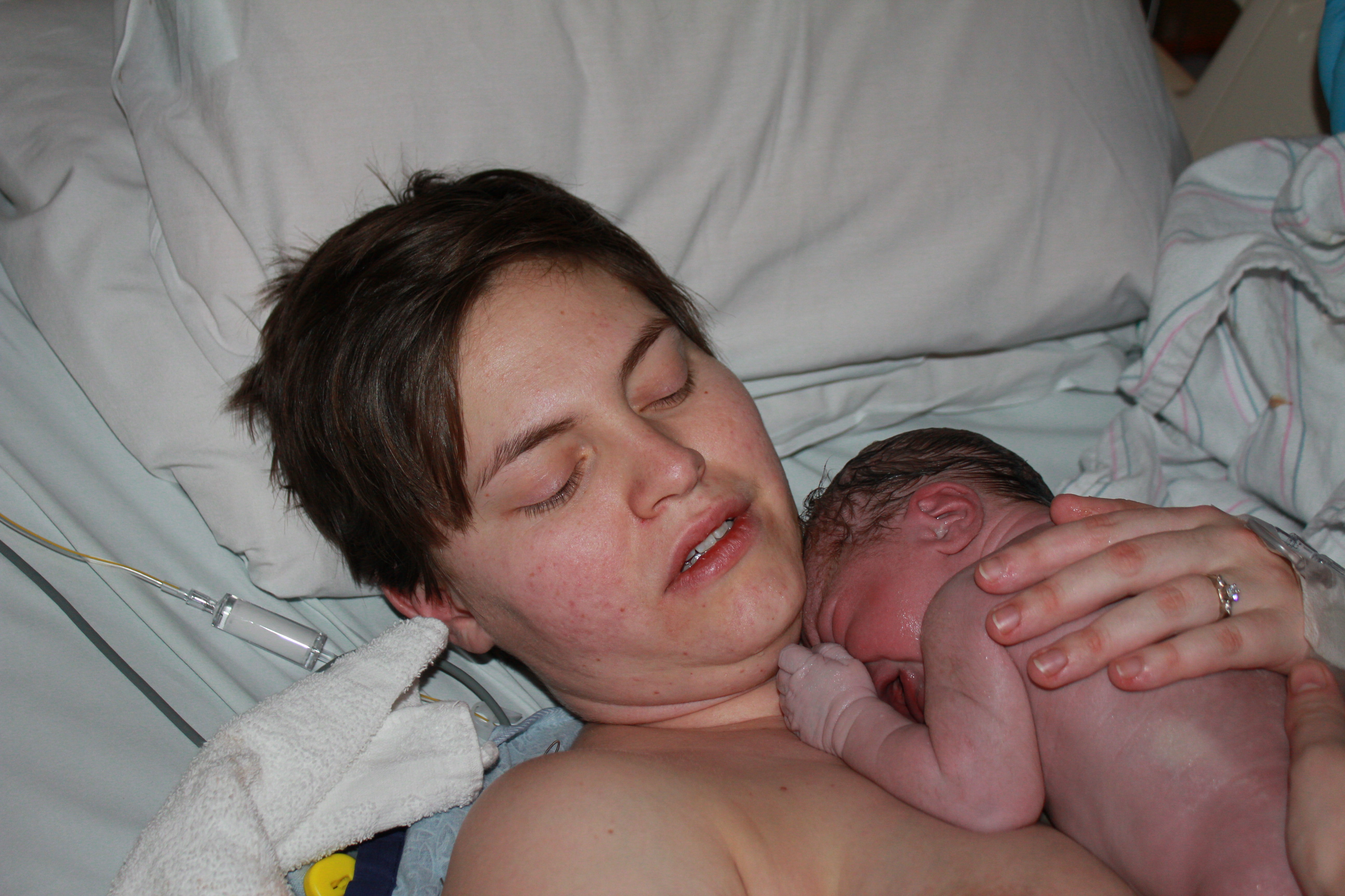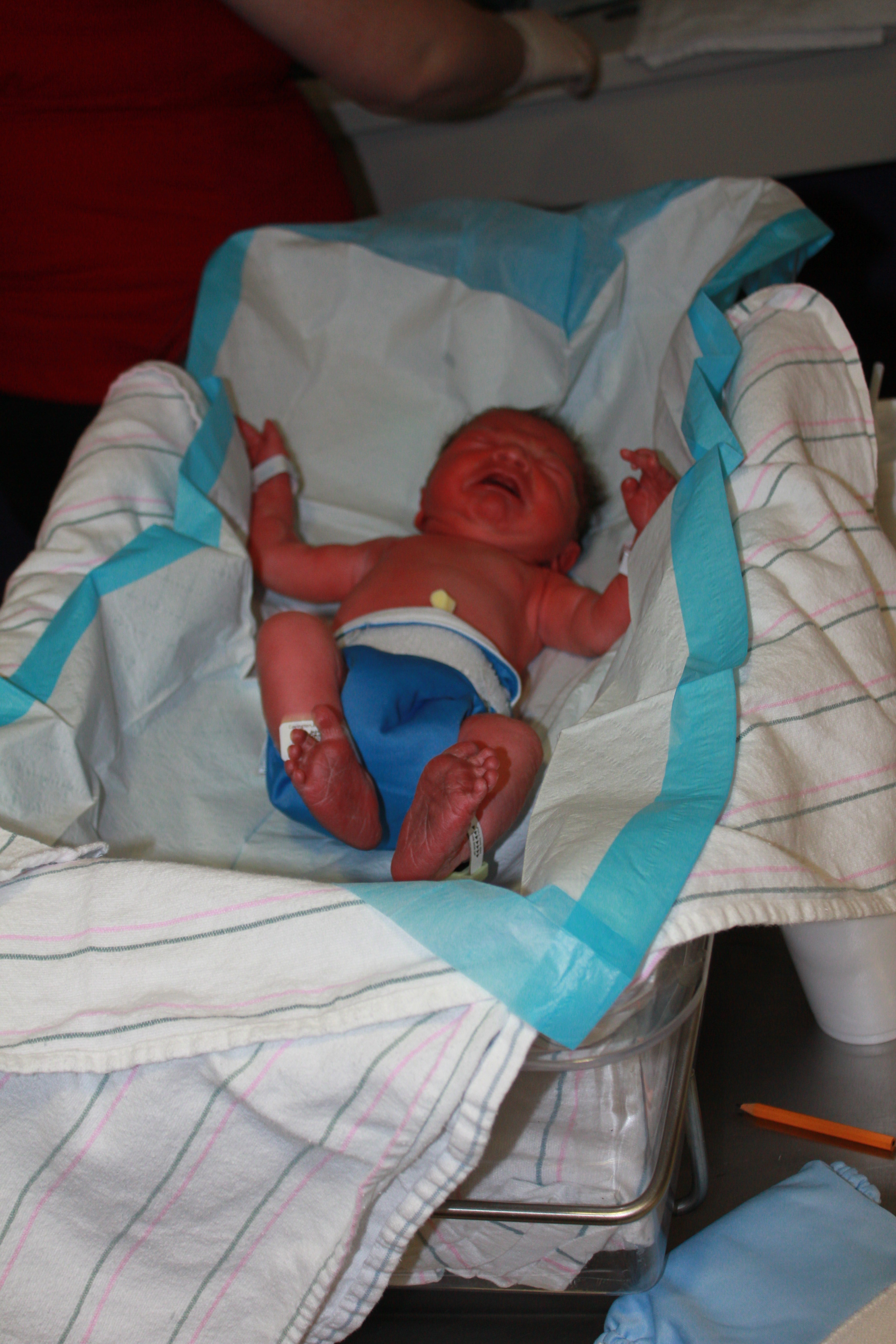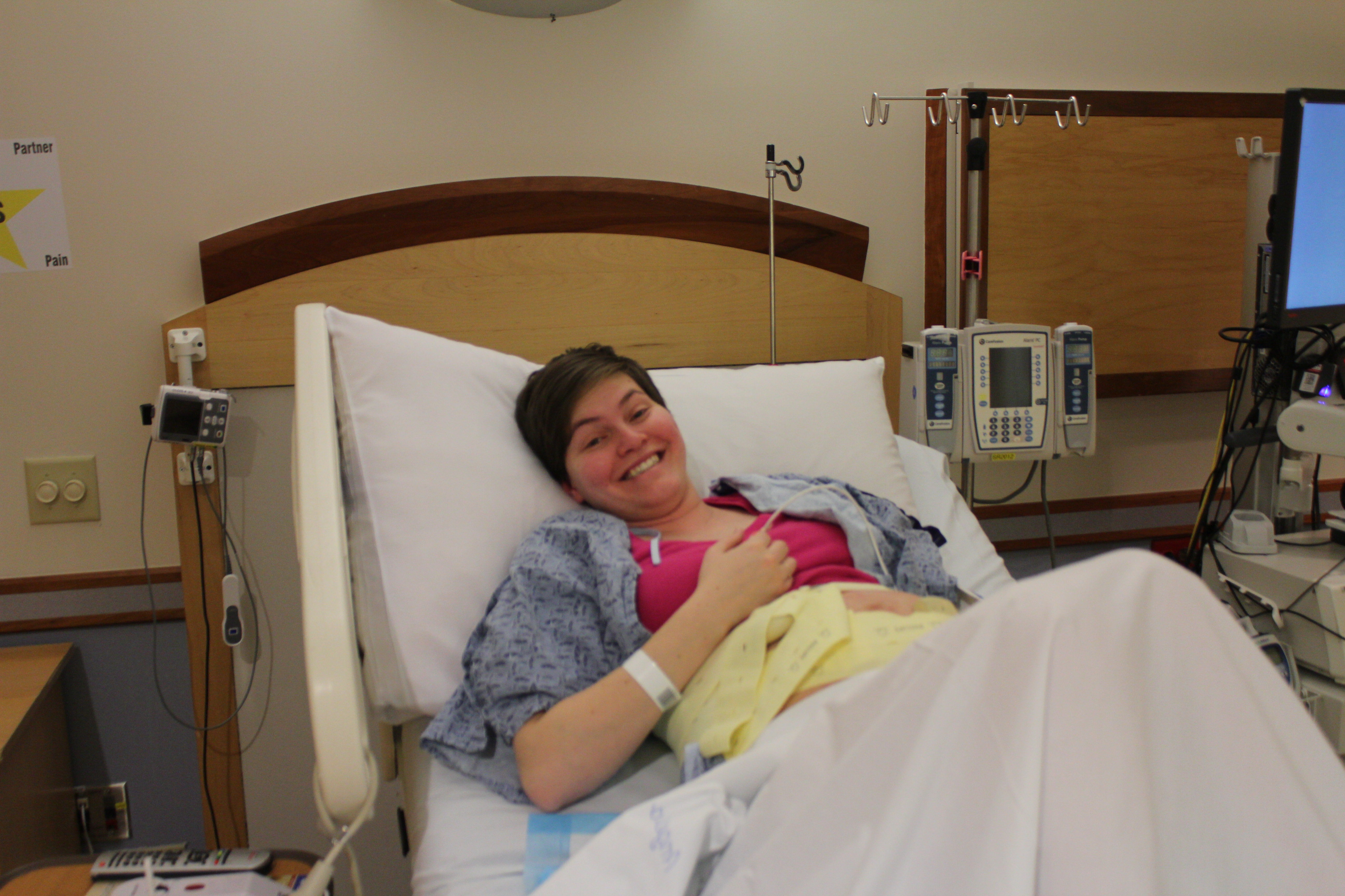 At 10:30 we had completed the discharge conversation with the dr, gotten dressed, and were just waiting for the iv to be removed. I had a contraction and tried to roll onto my side when I heard a pop and felt a gush. I was completely thrilled and rushed into the hall to tell the doctor. Things were a little shaky for the next 10 minutes while they considered the possibility I’d just peed myself since all the tests were either inconclusive or invalid because the blood that was present would also give a positive on the test. Within 10 minutes though labor had kicked into high gear and removed all doubt.