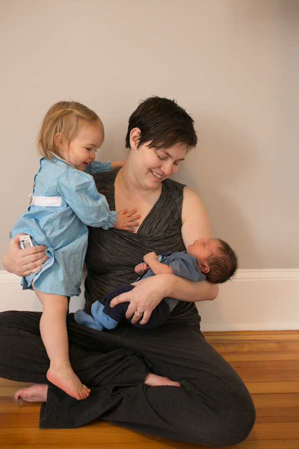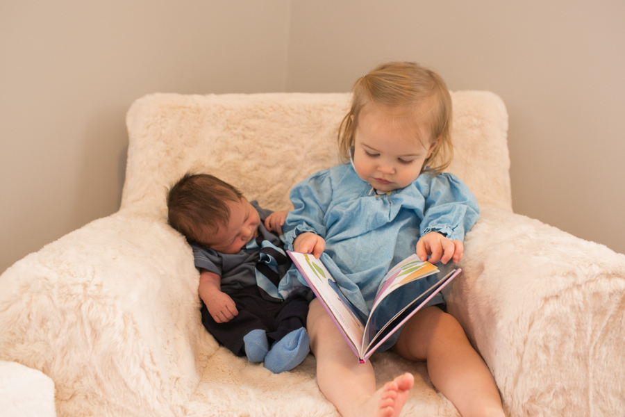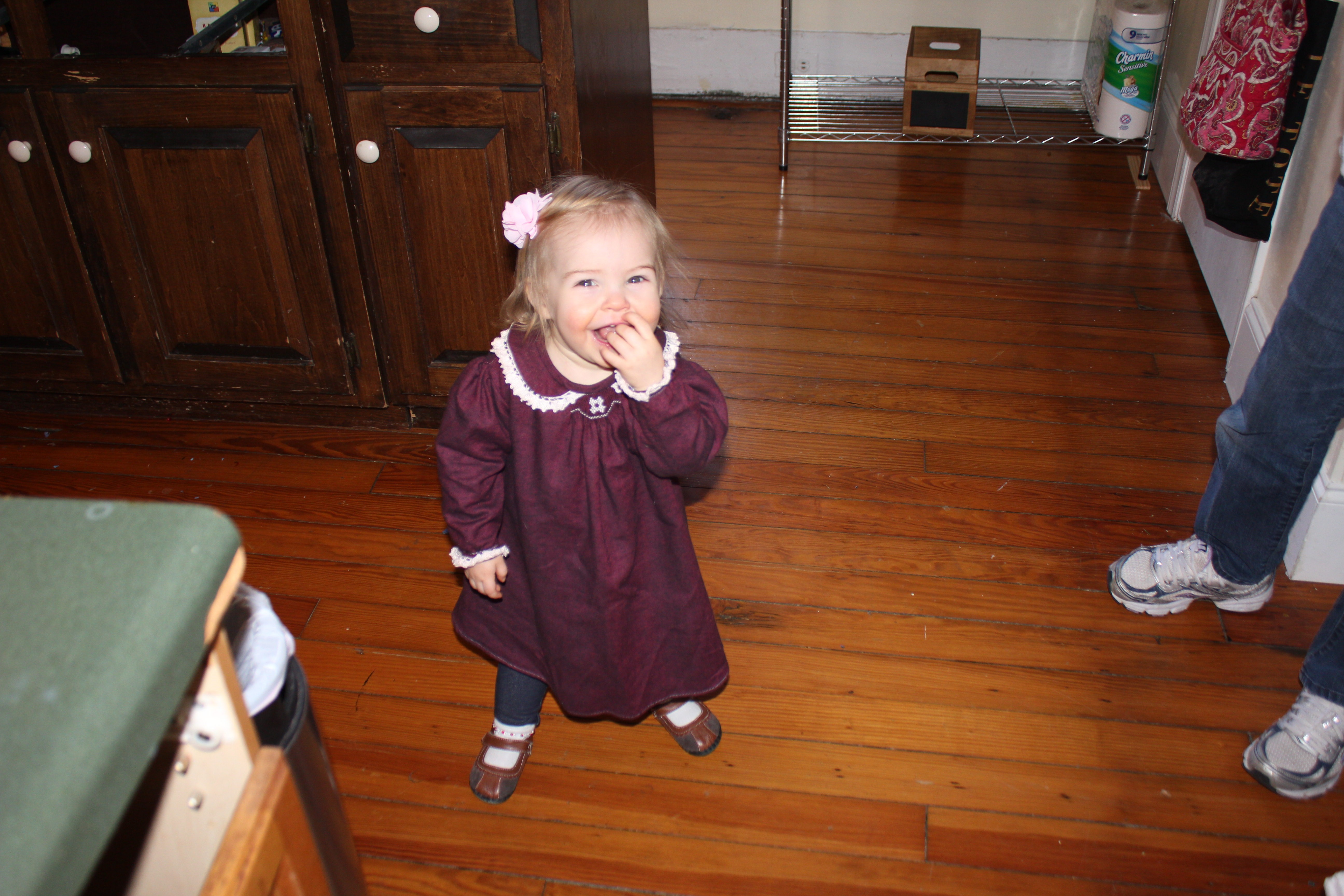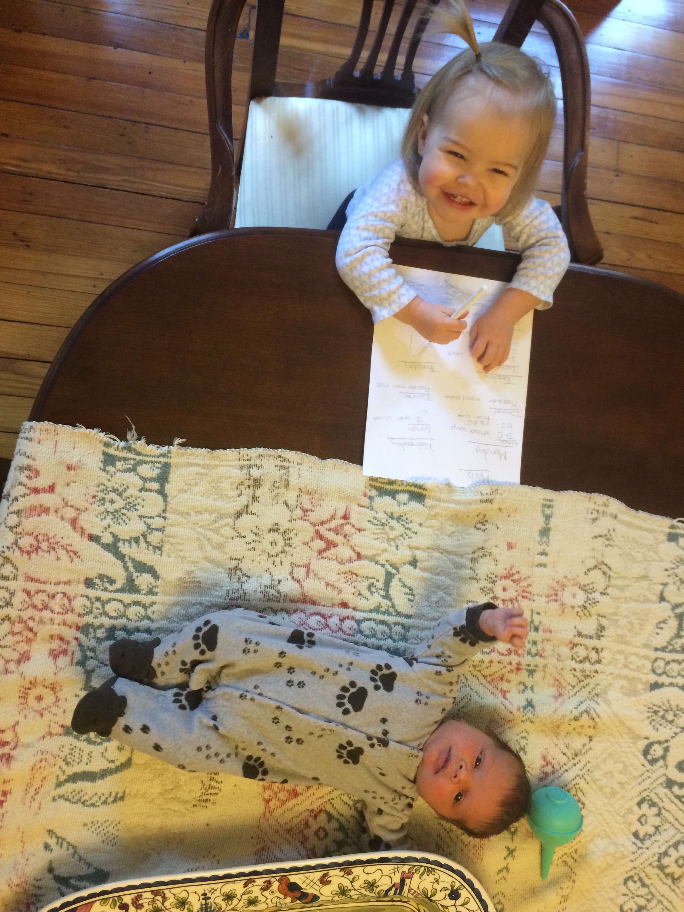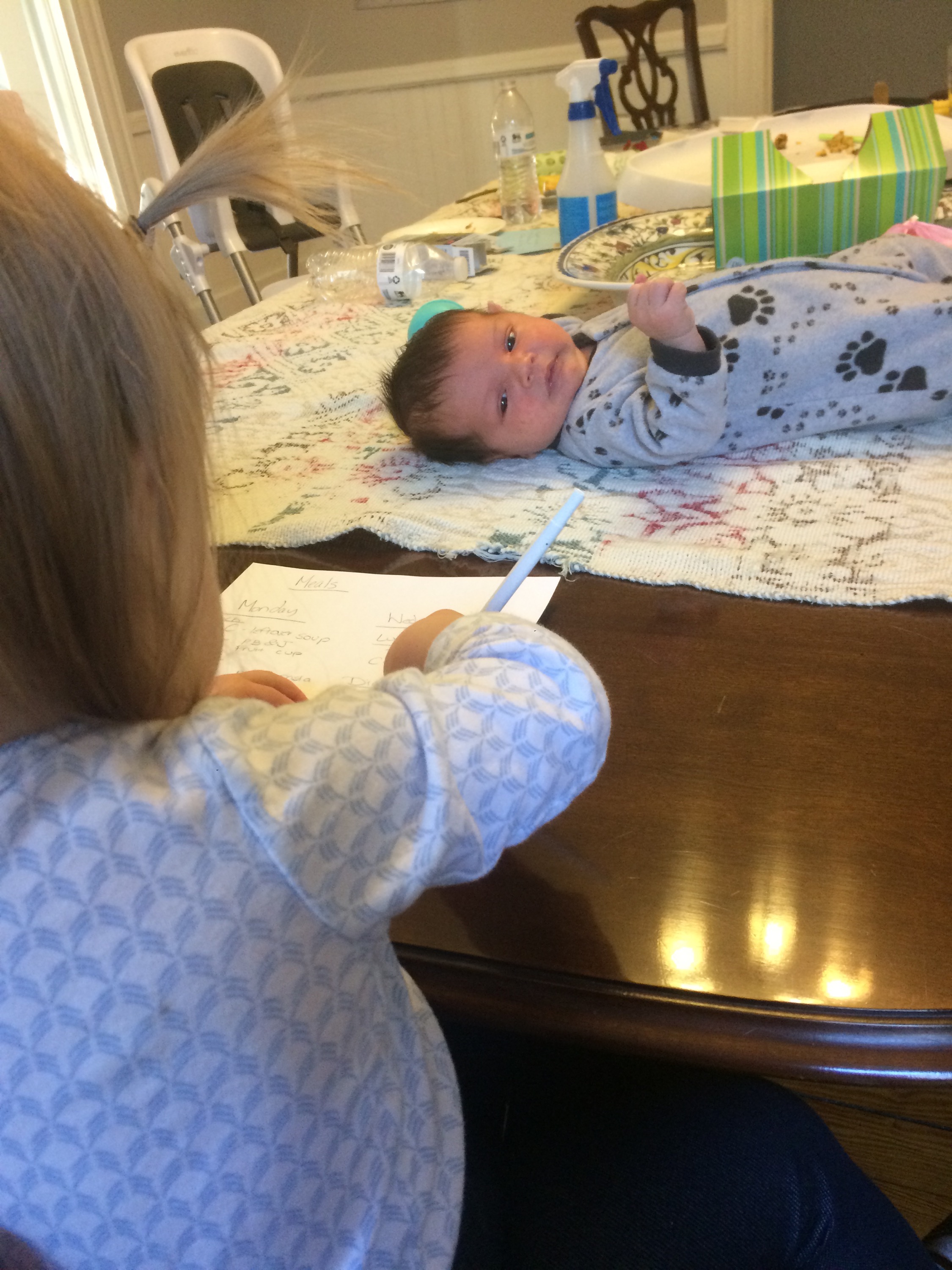Later in this same (not particularly long) nursing session Helen Jeanette was climbing on her chair (I let her climb on the arms but not the back because of the fall possibility) and she fell and hit her head. I had to take Killian off and leave him fussing on the couch and cuddle Helen Jeanette. I cuddled her until she calmed down and was fine to walk off, but as soon as she saw me pick up Killian all the hardship and tears returned. This time she only got an offer to sit with us on the couch, which she adamantly refused.