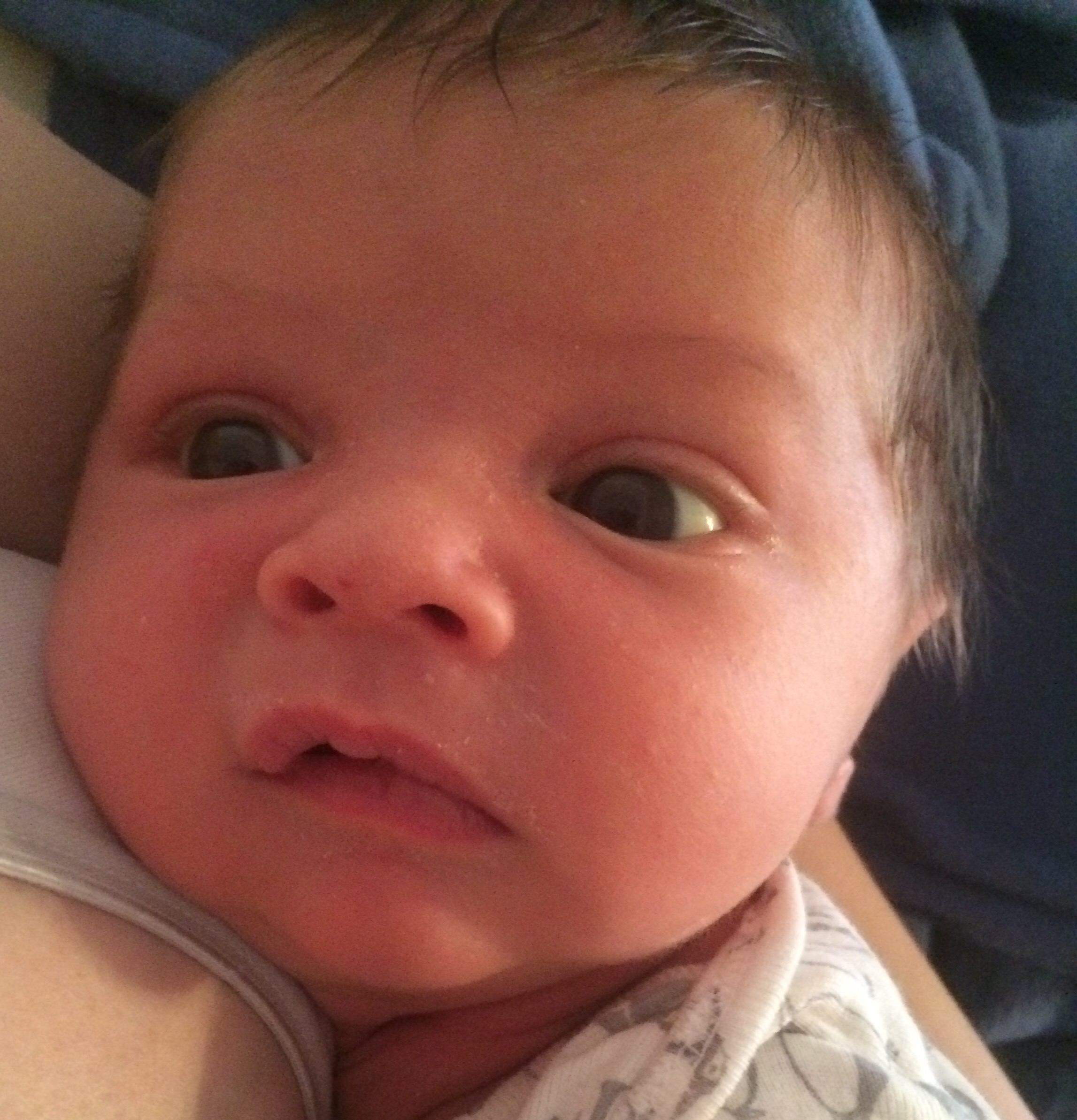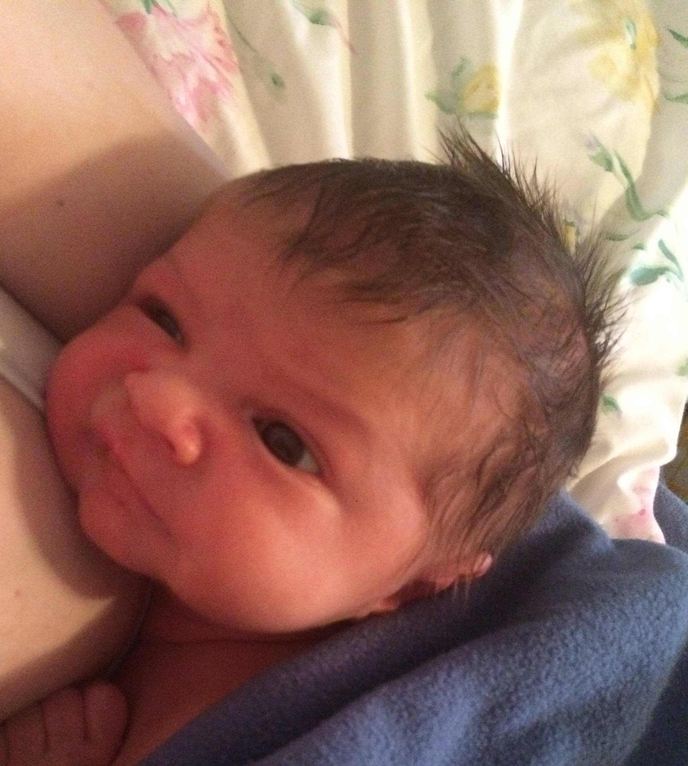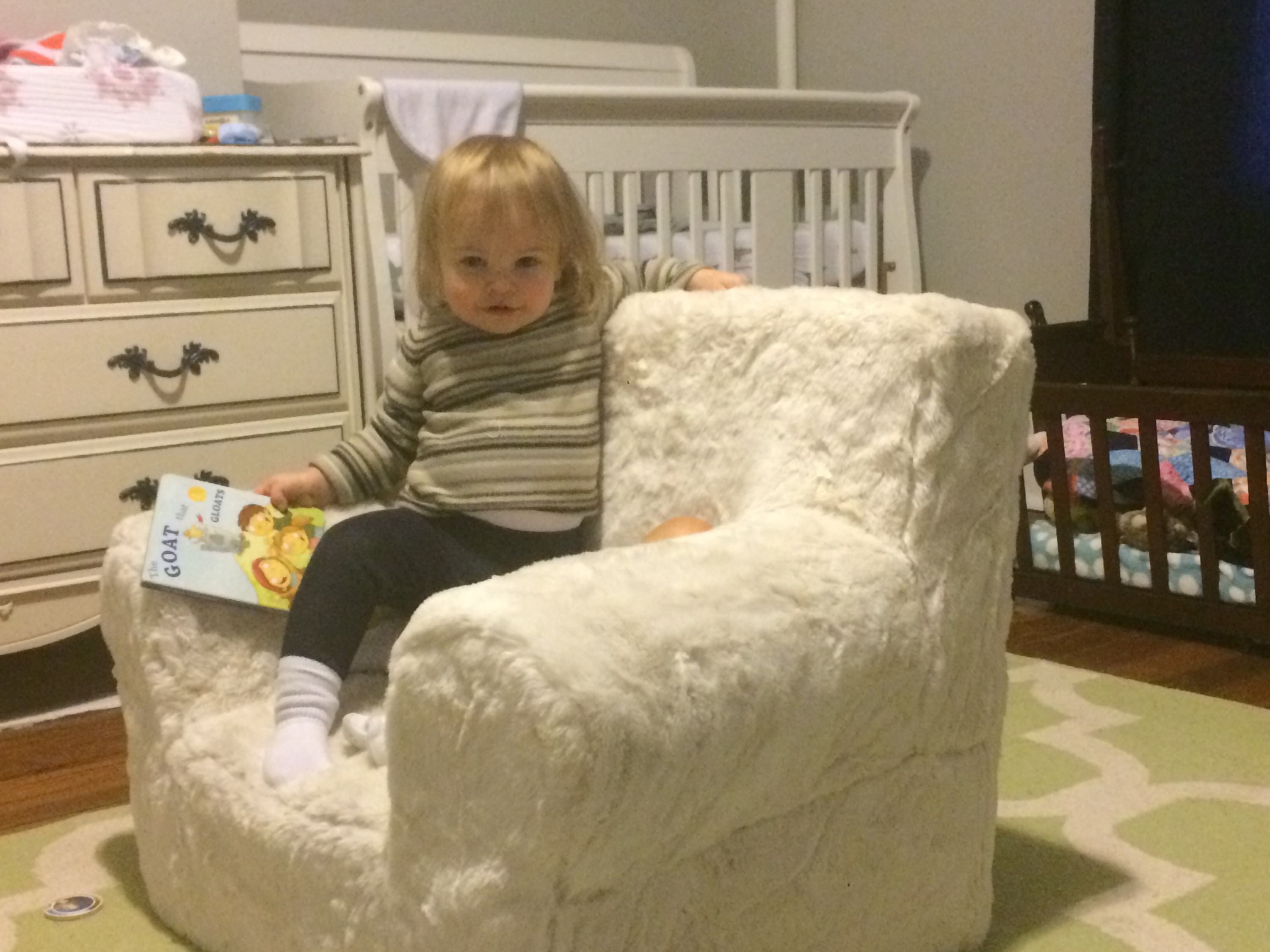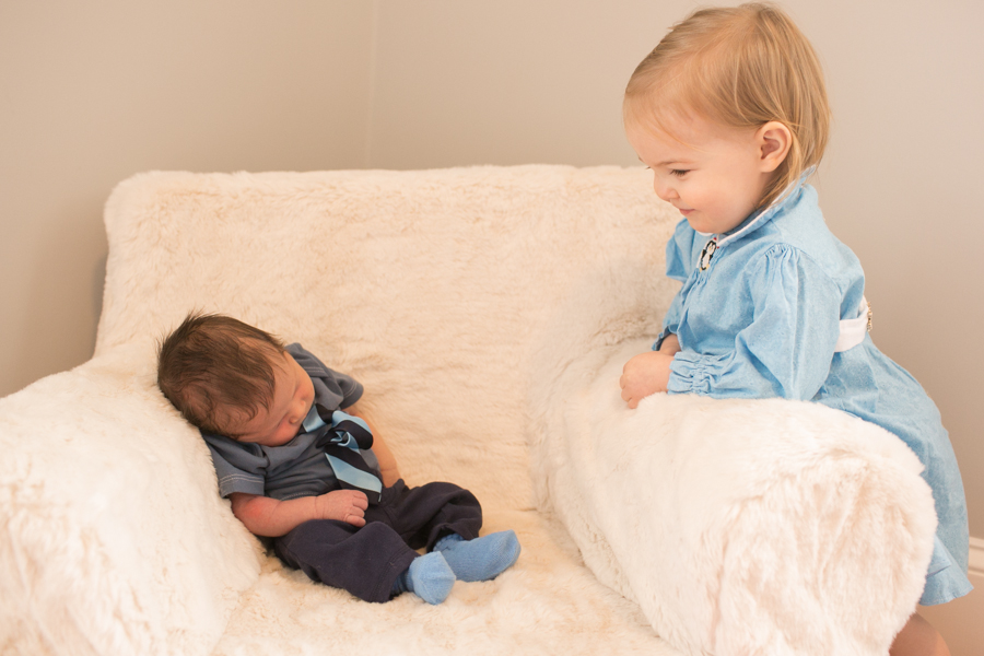 Later in this same (not particularly long) nursing session Helen Jeanette was climbing on her chair (I let her climb on the arms but not the back because of the fall possibility) and she fell and hit her head. I had to take Killian off and leave him fussing on the couch and cuddle Helen Jeanette. I cuddled her until she calmed down and was fine to walk off, but as soon as she saw me pick up Killian all the hardship and tears returned. This time she only got an offer to sit with us on the couch, which she adamantly refused.