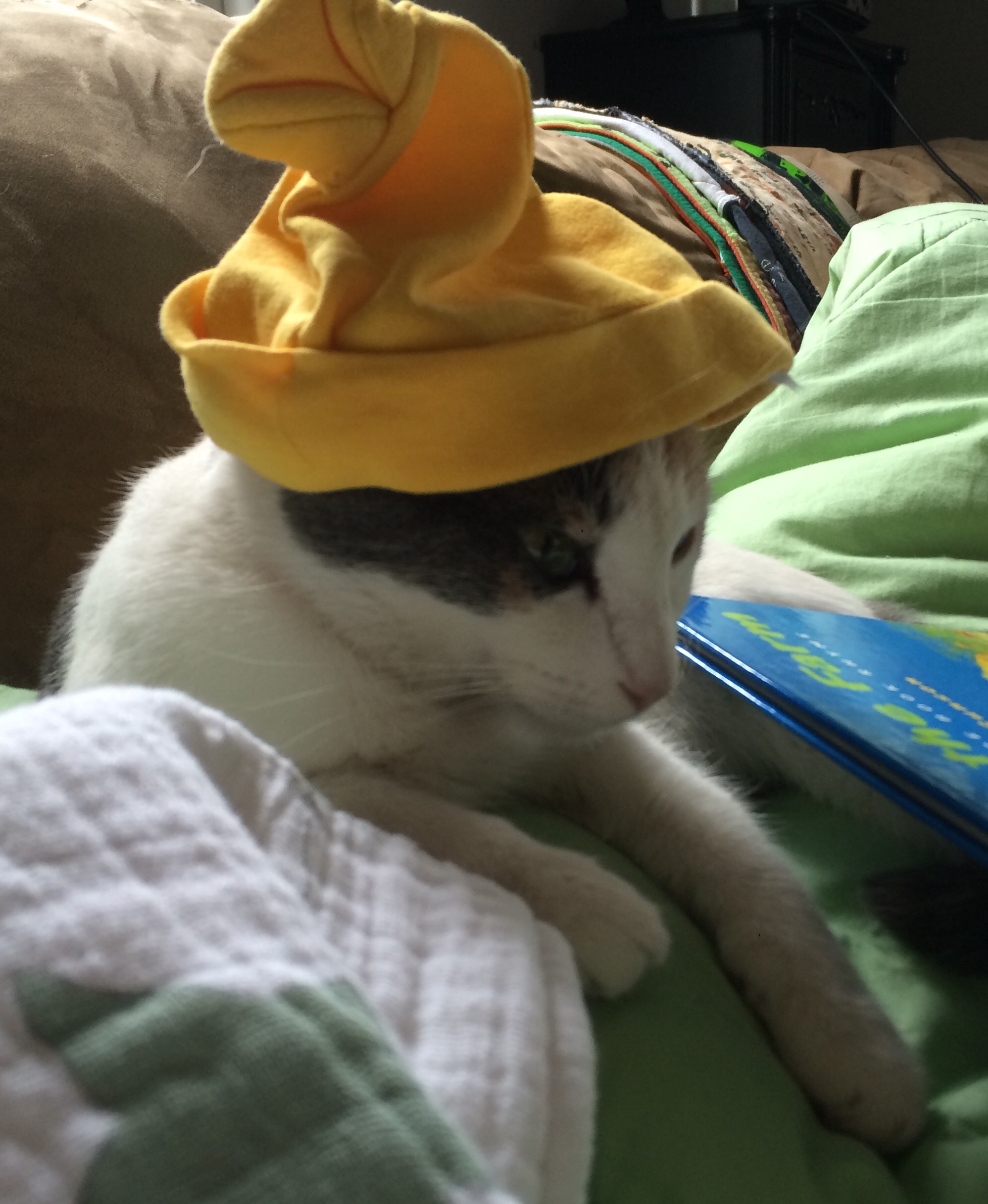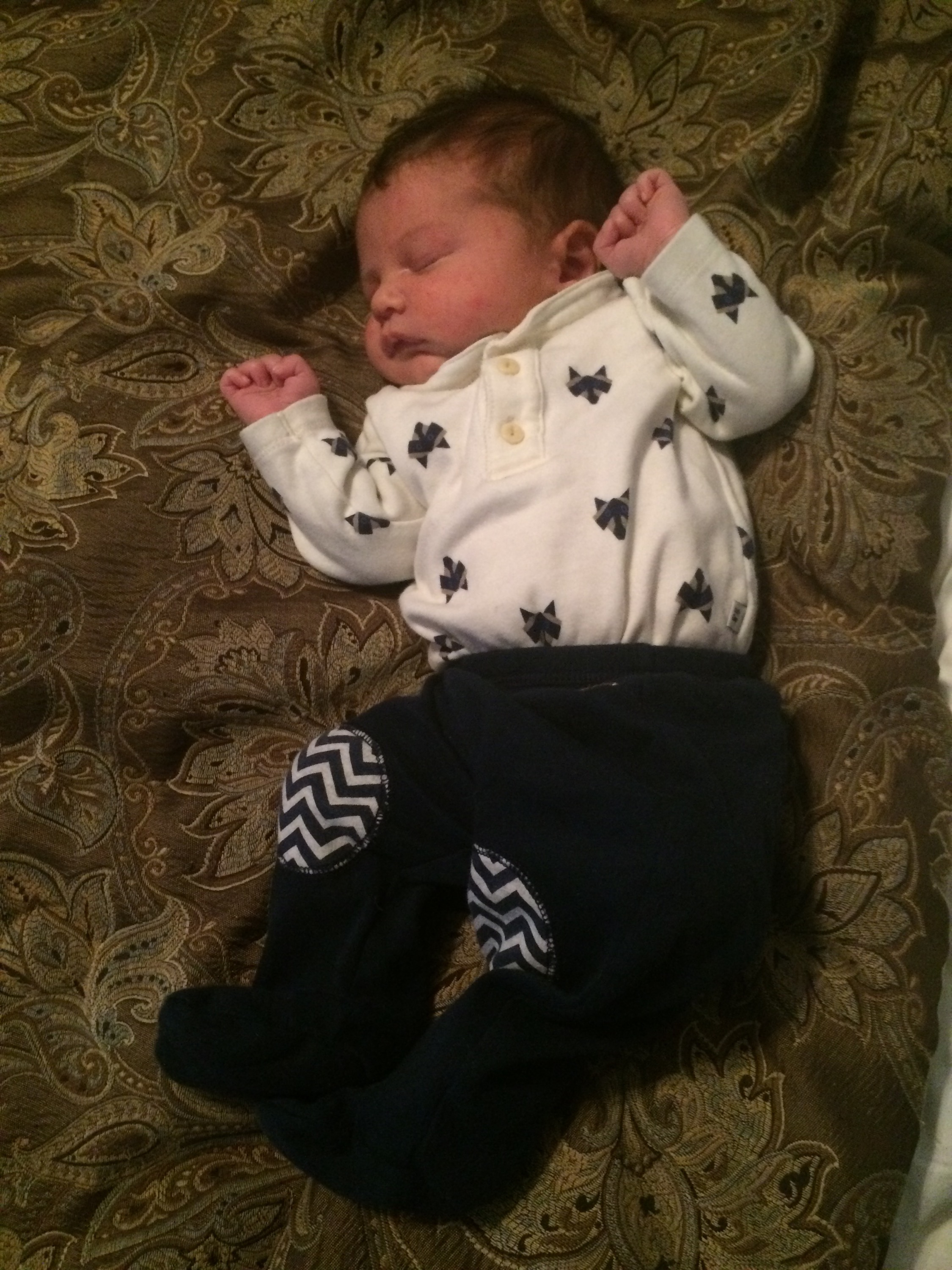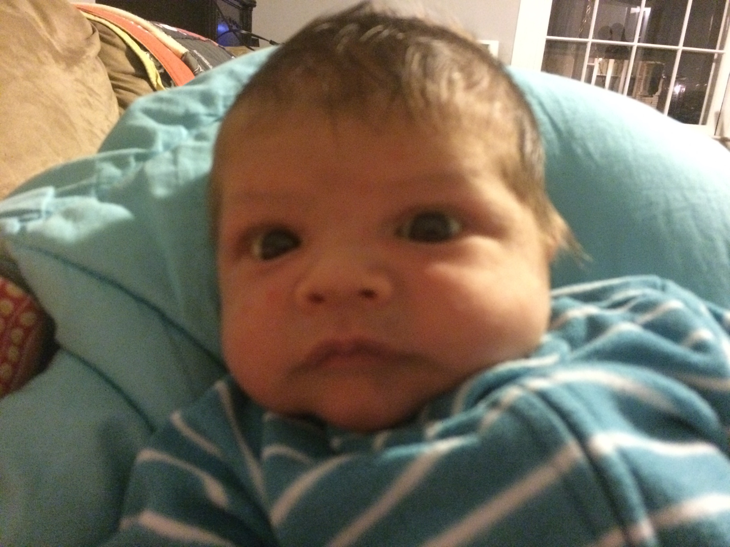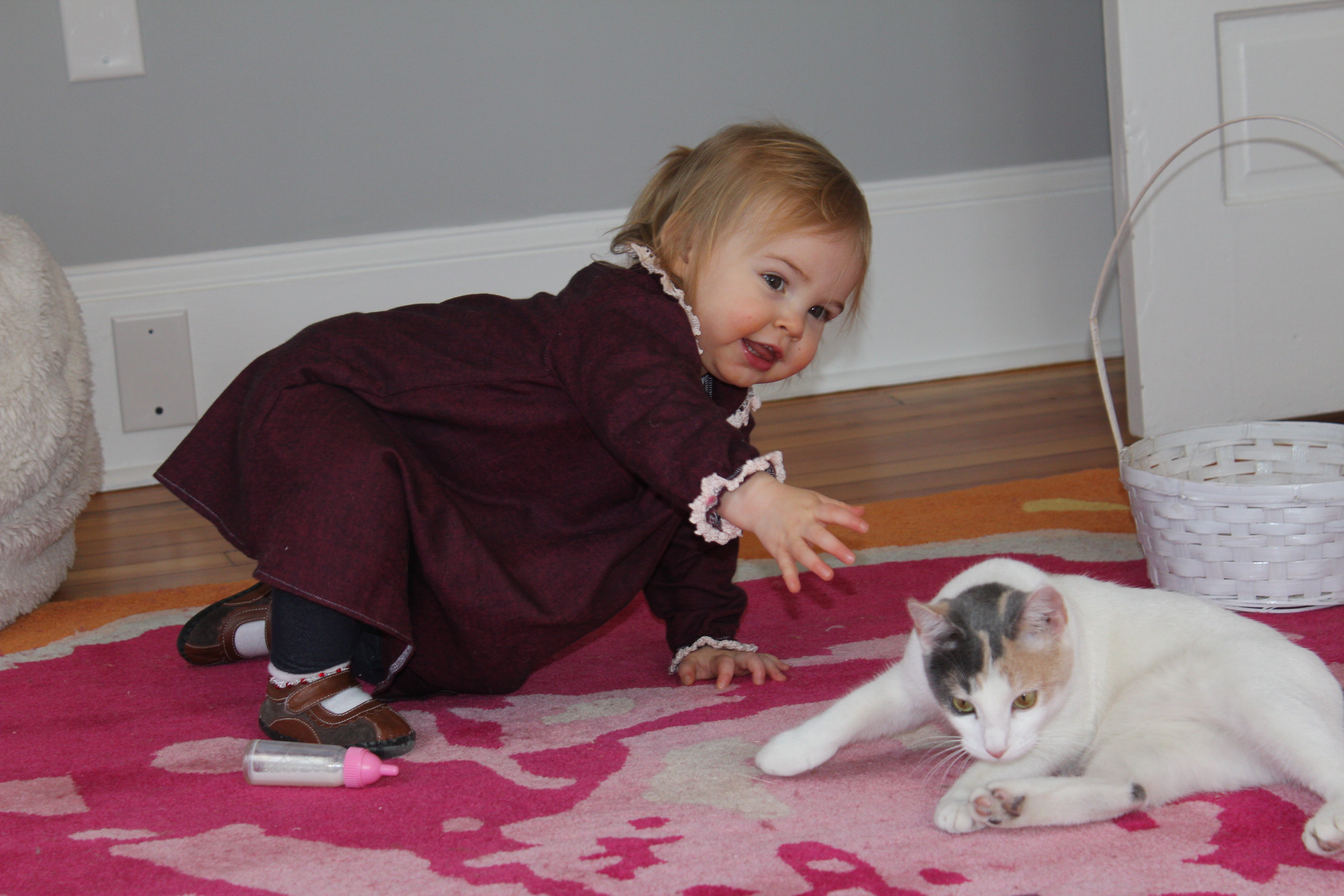 Later in this same (not particularly long) nursing session Helen Jeanette was climbing on her chair (I let her climb on the arms but not the back because of the fall possibility) and she fell and hit her head. I had to take Killian off and leave him fussing on the couch and cuddle Helen Jeanette. I cuddled her until she calmed down and was fine to walk off, but as soon as she saw me pick up Killian all the hardship and tears returned. This time she only got an offer to sit with us on the couch, which she adamantly refused.