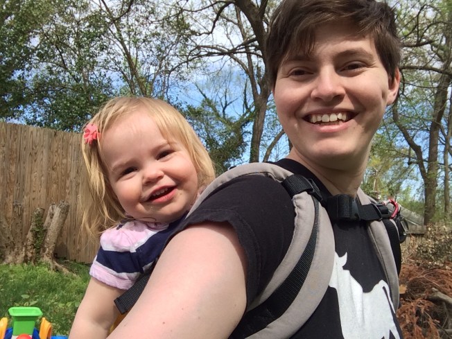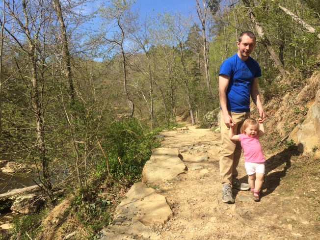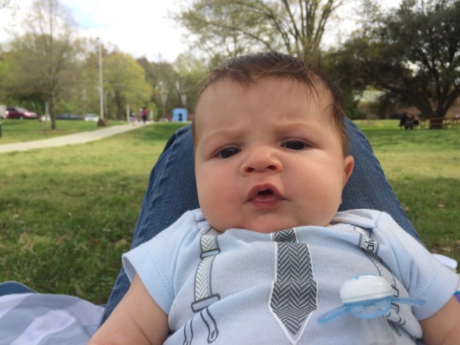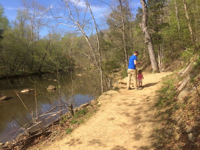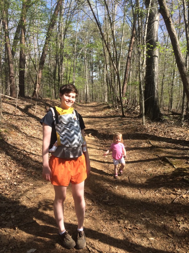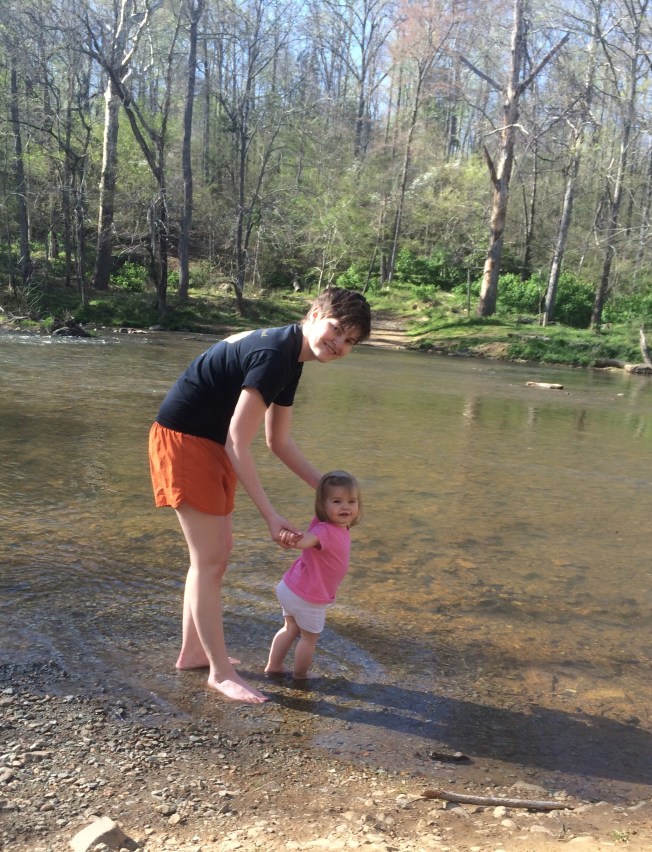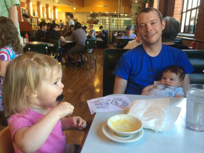 After nap we test drove our new baby carrier at the Eno river park. It was beautiful but we were underprepared with sun protection and snacks. Fortunately it was after 4 so the sun wasn’t too intense and Helen Jeanette made it to the diner where she demolished a bowl of Apple sauce while waiting for her pancakes.