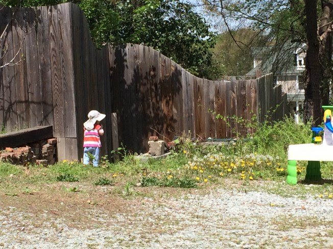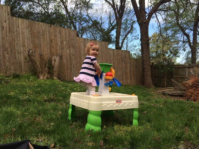 Today was another beautiful springy day. We started off at the little gym for our last class before we pause for the summer. Then we played in the backyard until lunch, Daddy mowed the front yard and Mommy weeded and mulched the blackberry bushes while Helen Jeanette climbed everything she could. We pulled the water table out and she had a ball with it sans water.