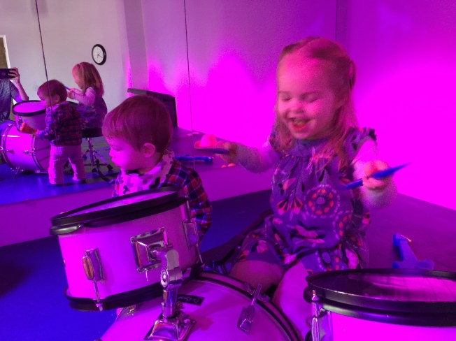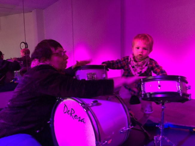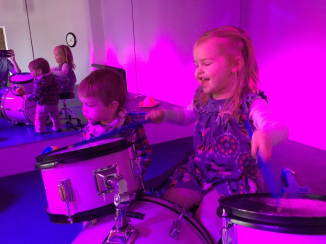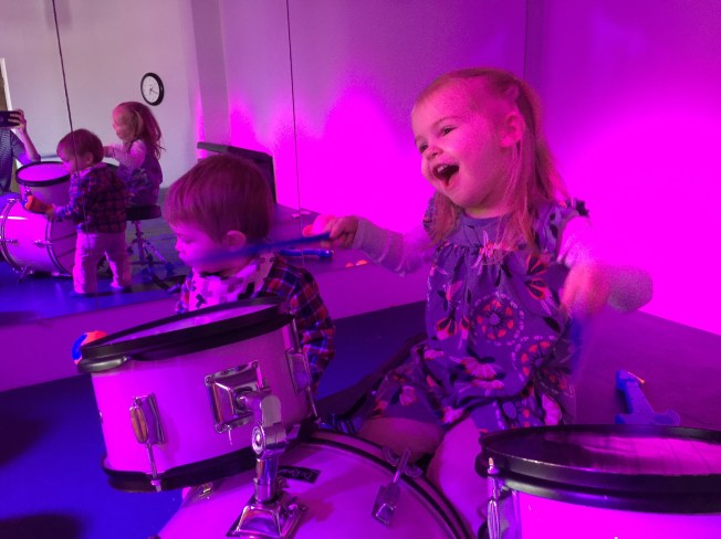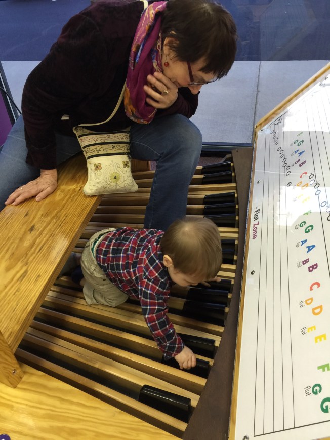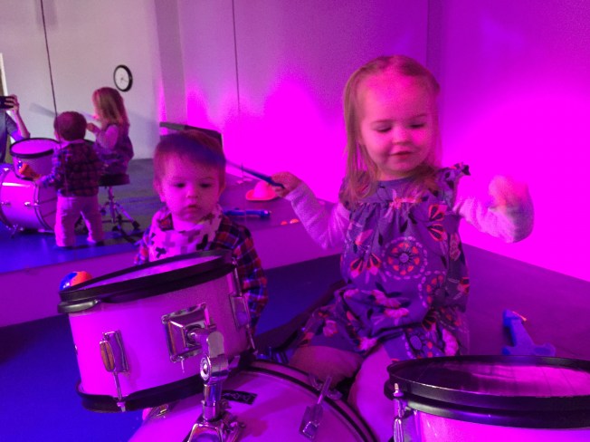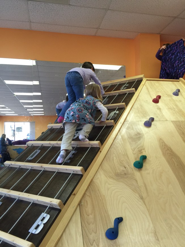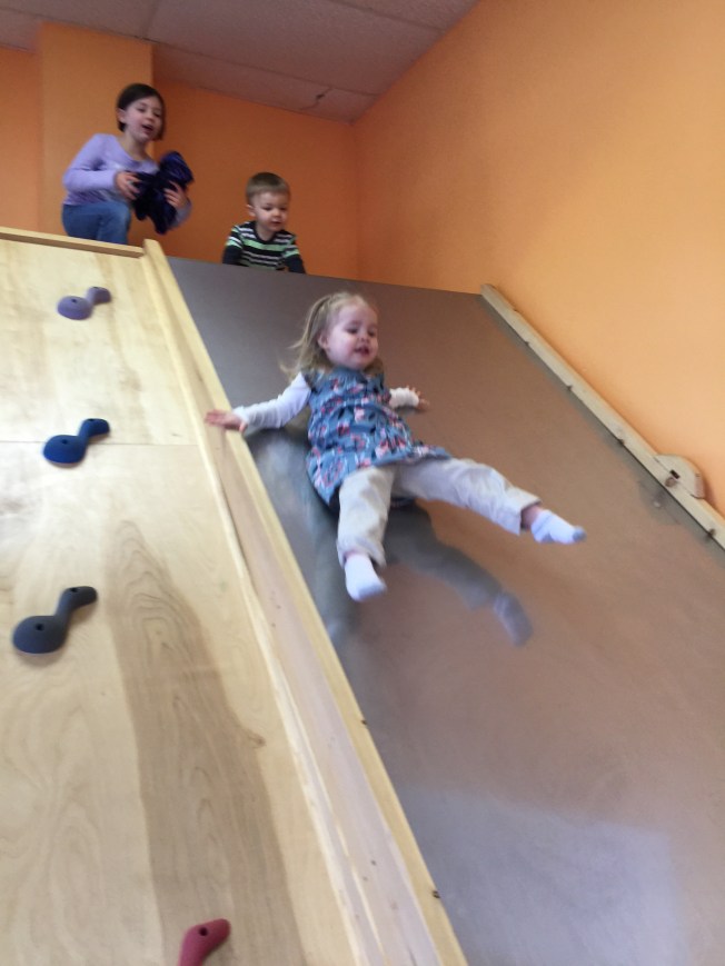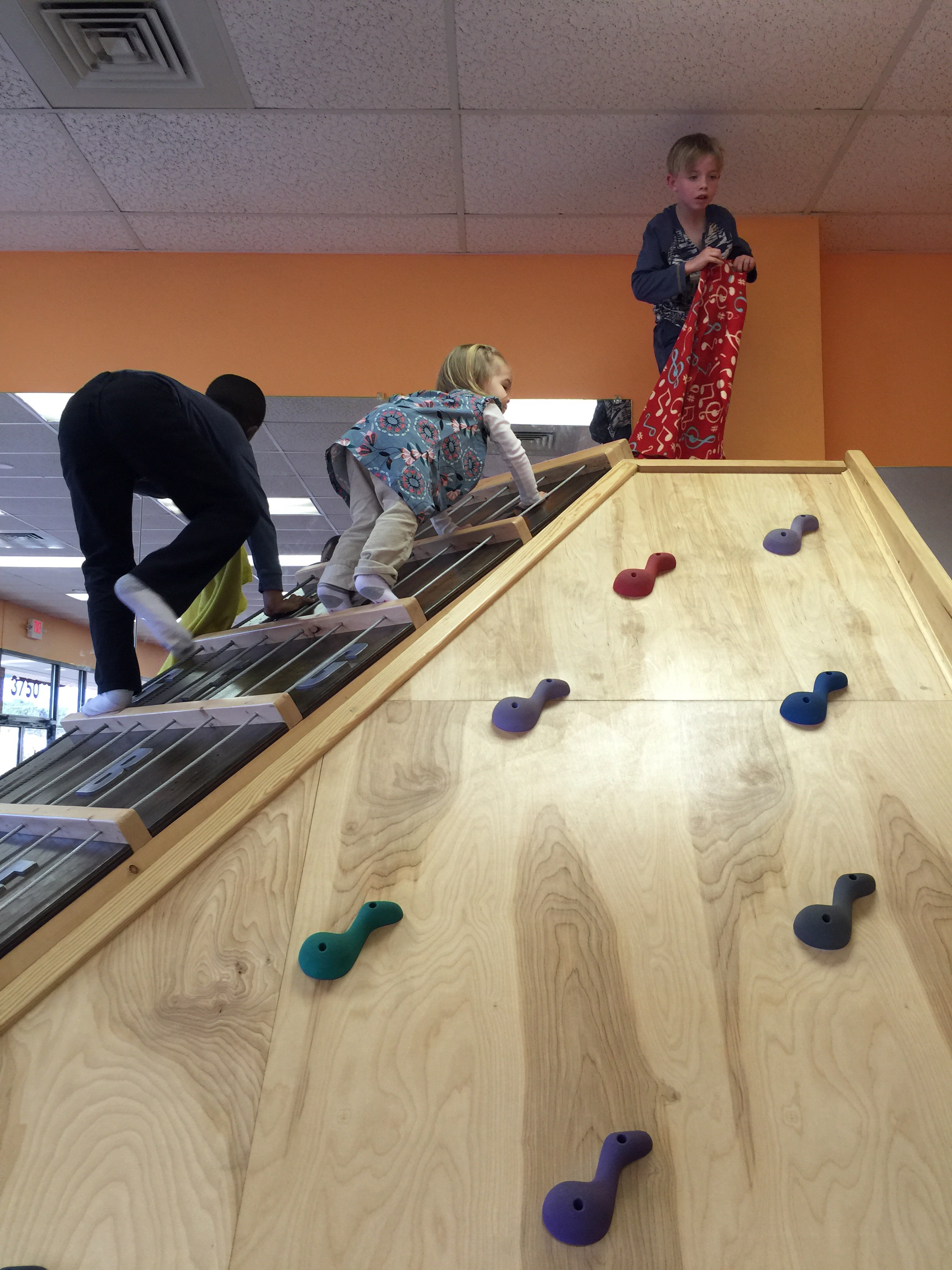 Today we finally checked out Notasium in Durham. It’s a music-based indoor play place and they also have karaoke and music lessons. I was really impressed with it and the kids both loved it. There was a bouncy house and a big slide. Helen Jeanette climbed up and slid down the slide twice before deciding it was too scary and then she climbed up several more times and insisted I climb up and slide with her.