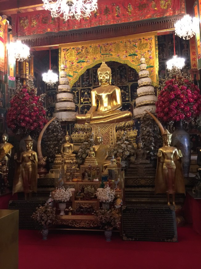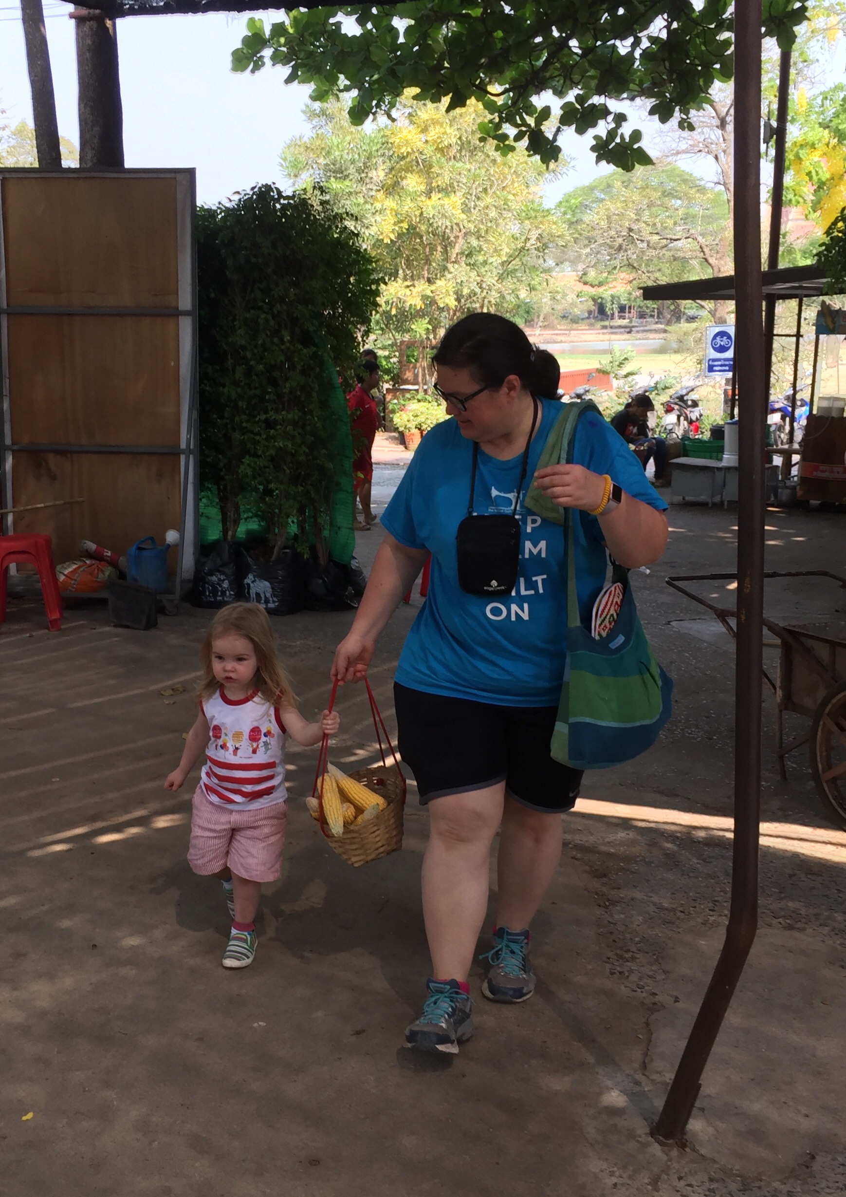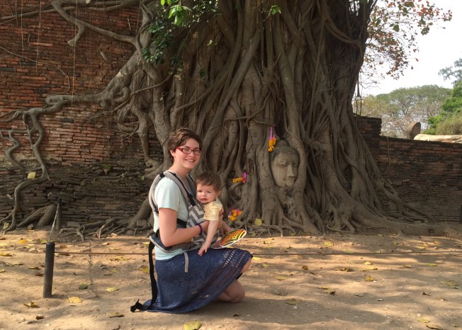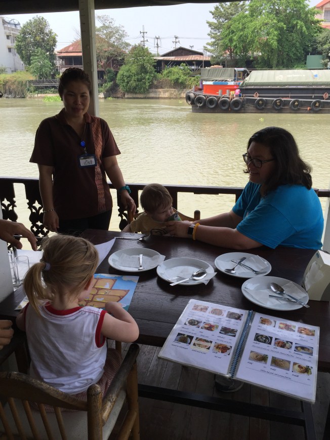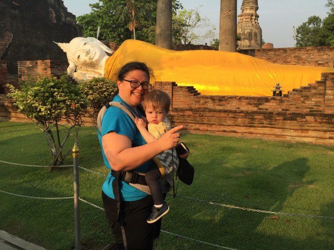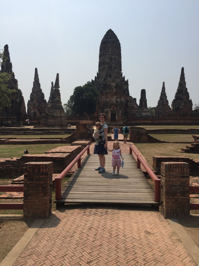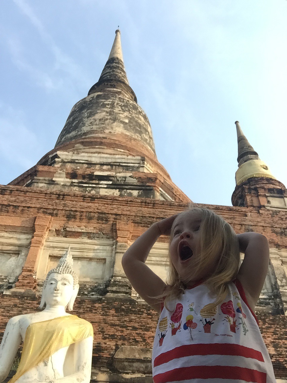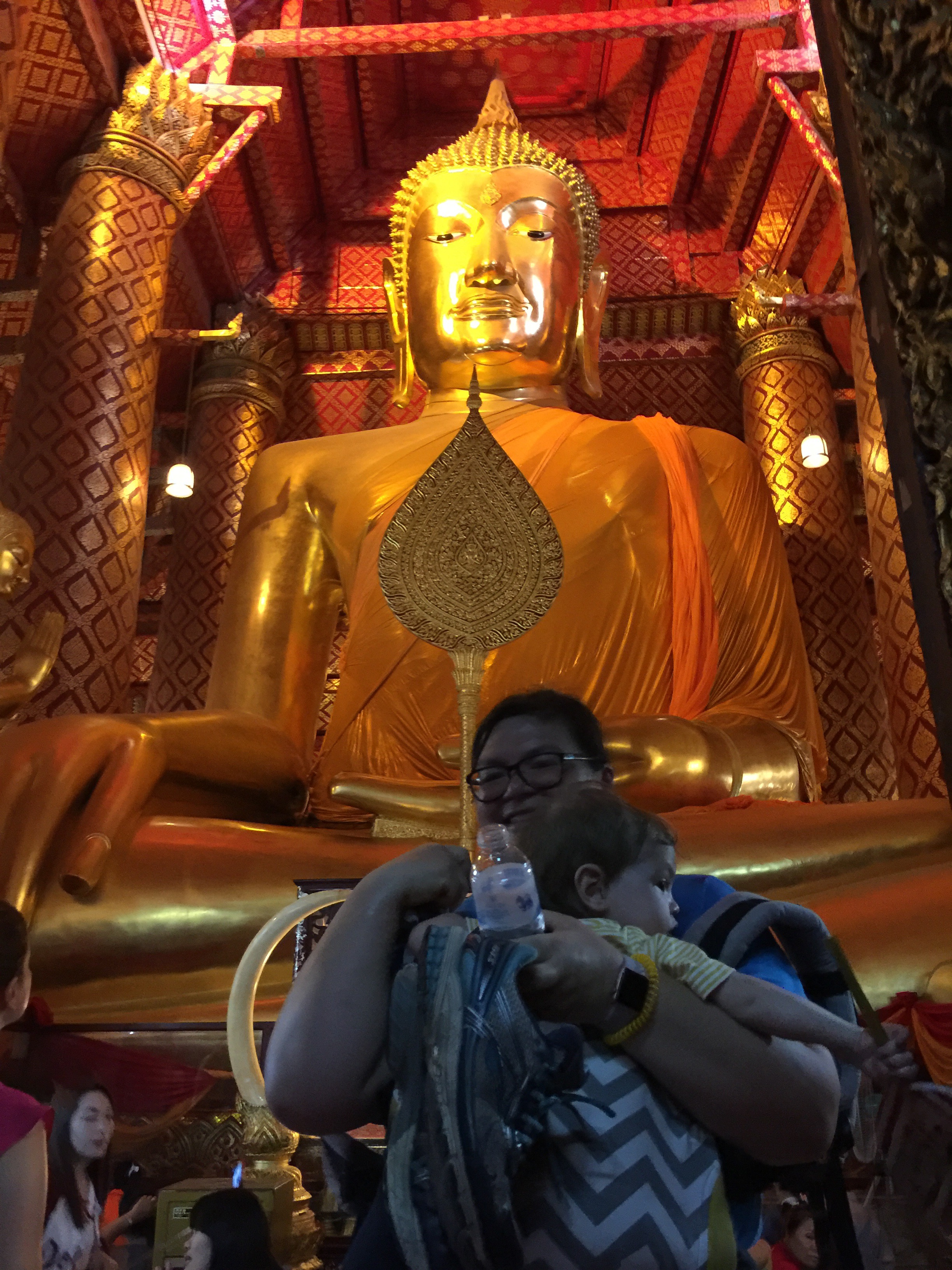 The second temple, Wat Panan Choeng, was less impressive and also wouldn’t qualify as ruins. It seemed new and quite kitschy compared to the others we had seen. This one was a Chinese Buddhist temple and you could tell by the gold lanterns and the fat Buddah. Helen Jeanette had a melt down here because she couldn’t touch anything and ended up having to go in the baby carrier, which has been distressing her lately because she ”is not a baby.”