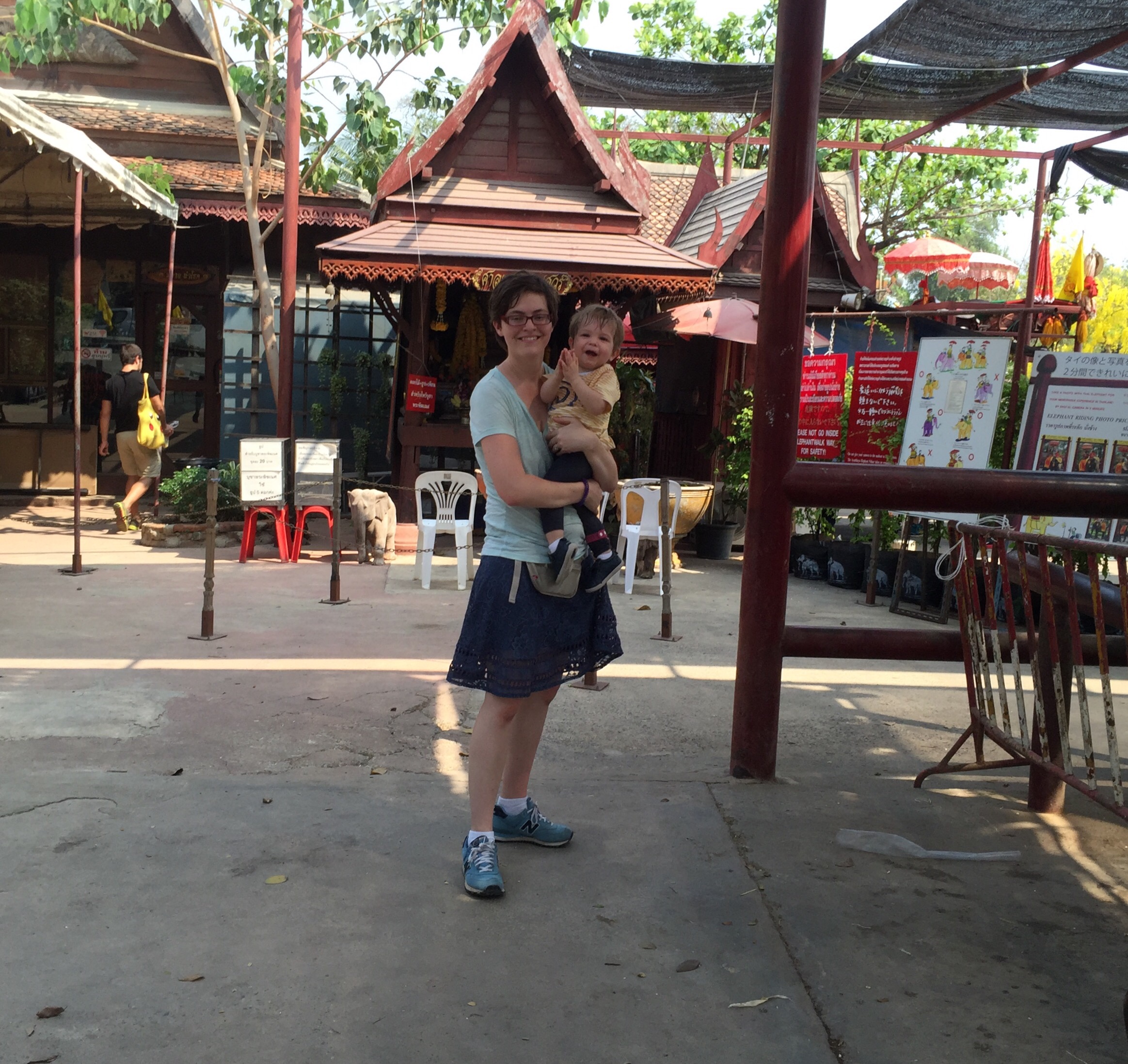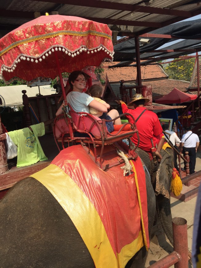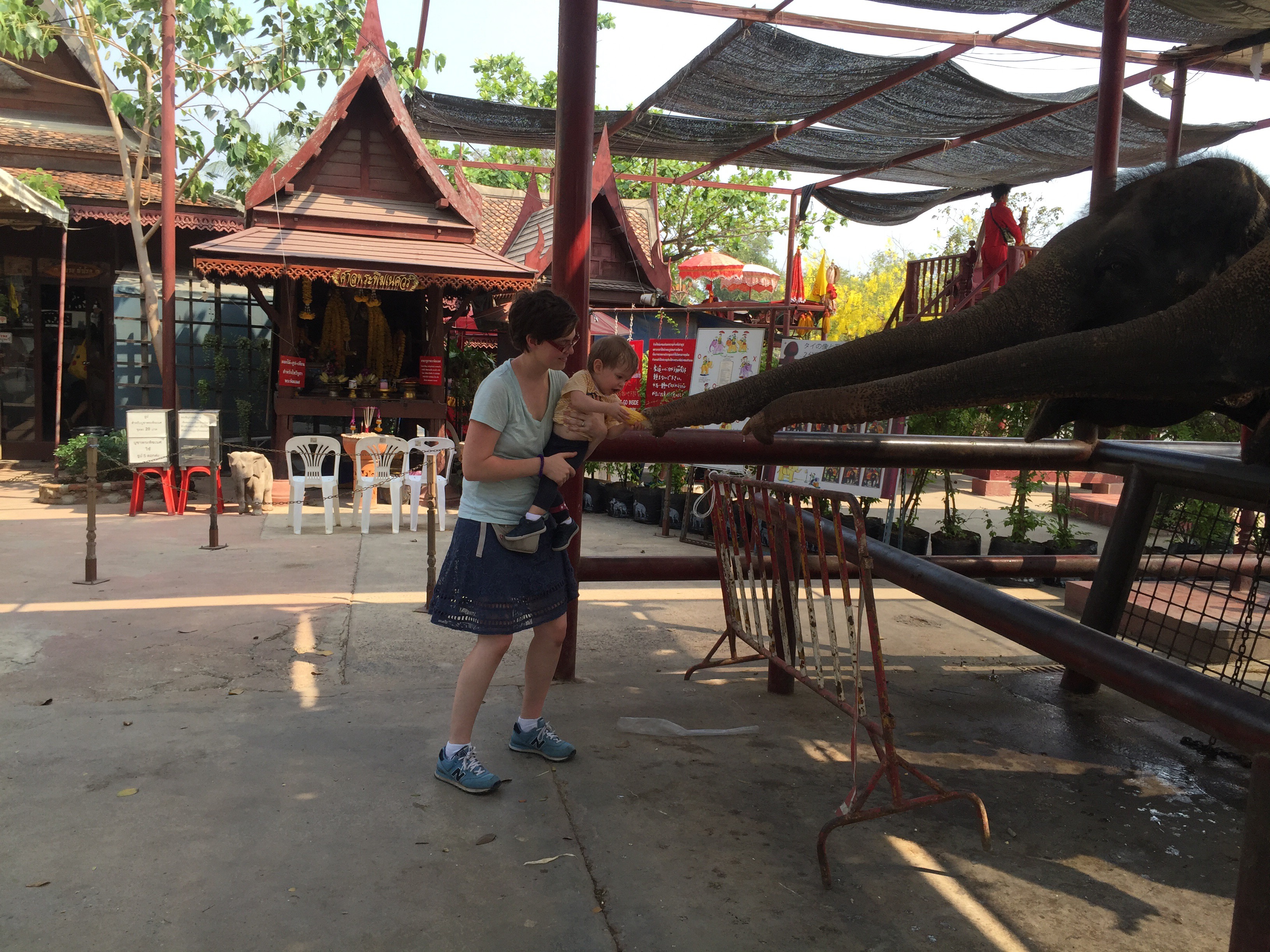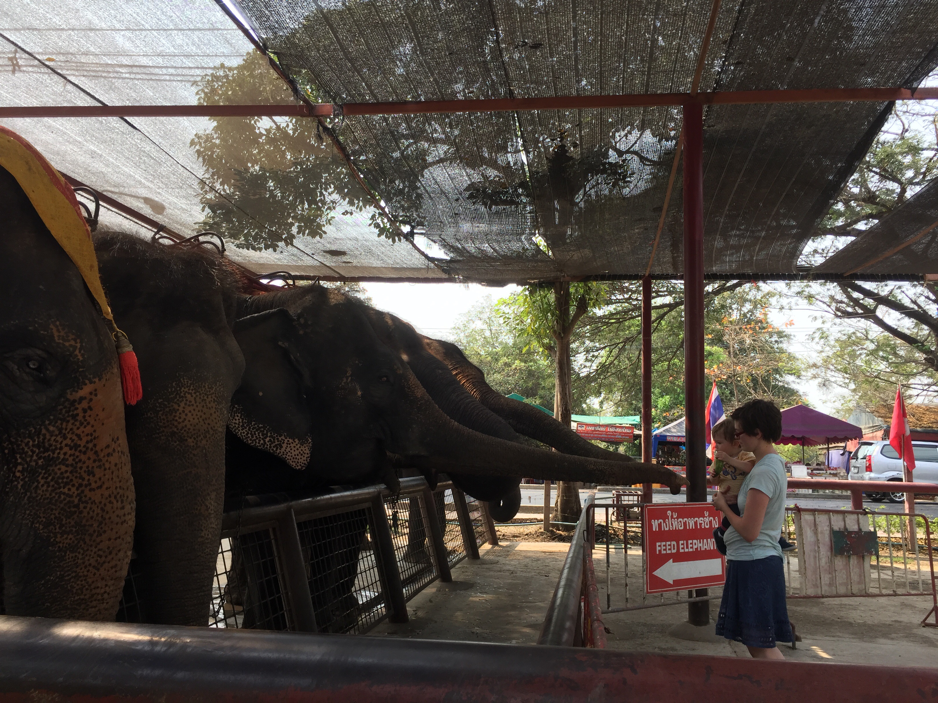 Our next stop was elephants but we had to have a stern talk about not whining. I knew I would be so frustrated if we drove all that way and she was too tired to enjoy them. The talk was unnecessary though because she completely perked up when she saw the elephants. For 1000 baht we had 2 elephants take us around for about 10 minutes. I honestly really regret going with Killian because he wouldn’t keep still and it felt really dangerous. The driver would turn nervously any time he squirmed too much so I felt like it was affecting the elephants balance. Killian loved it but he didn’t understand why he couldn’t switch elephants mid ride or climb up the umbrella. Helen Jeanette, who was riding with my Mom, was perfectly still and floating on cloud nine. The ride itself was very bumpy and we went in the road so there were cars zipping by us.