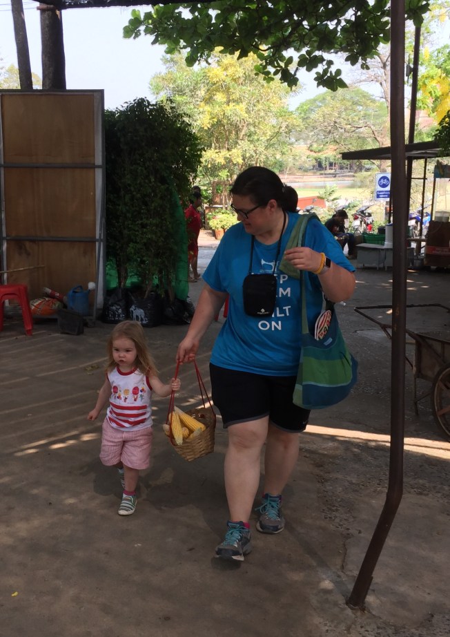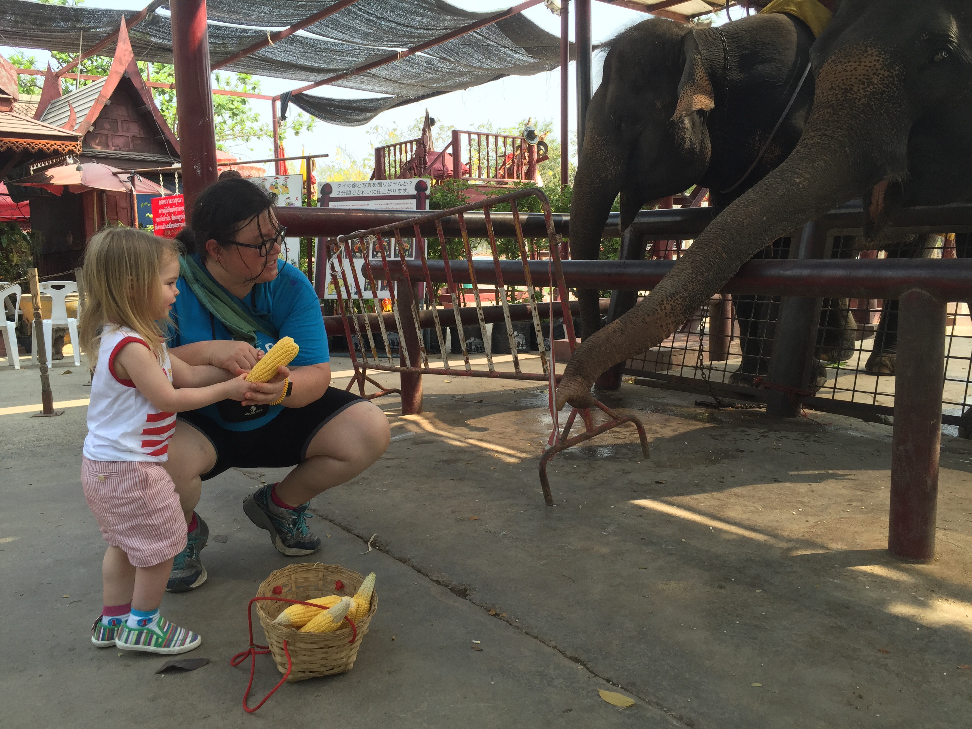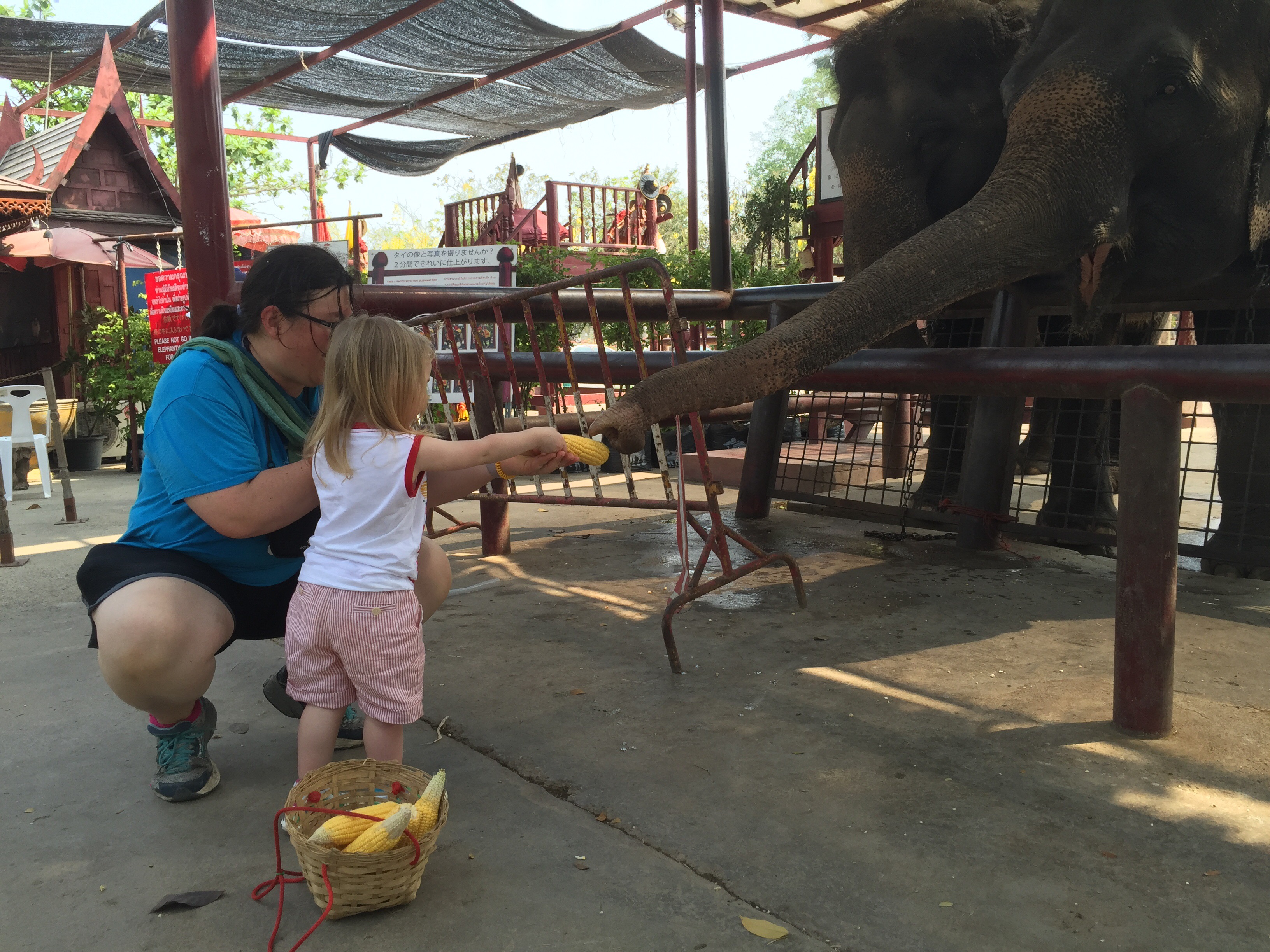 After the ride we paid 50 baht each for 2 baskets of food to feed the elephants. Both kids loved this and were so sweet about it. The only scary thing here was that an elephant escaped and came from behind to eat the food directly from the basket. I grabbed the kids quickly but they probably would have been safe staying where they were since the elephant was only interested in the food. For me feeding the elephants was the highlight over the ride because the kids were so into it and it was so cute to see Helen Jeanette carefully alternate between elephants to be sure the food was dispersed evenly.