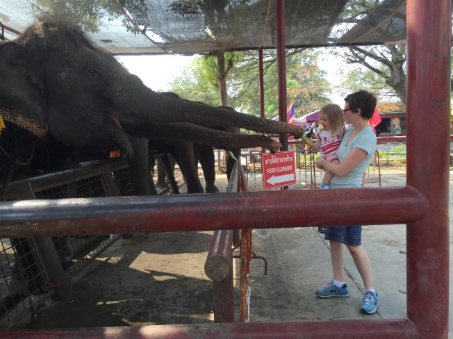 Our plans for the last day in Thailand were only cemented at 3 am this morning when we booked a taxi to Ayutthaya (pronounced U.T.I. by the locals and heard by us), the former capital of Siam that was sacked by the Burhamese. Our intention was to see elephants for Helen Jeanette who was saying for weeks leading up to the trip, ‘I’m going to Bangkok Thailand to see elephants and monkeys.’