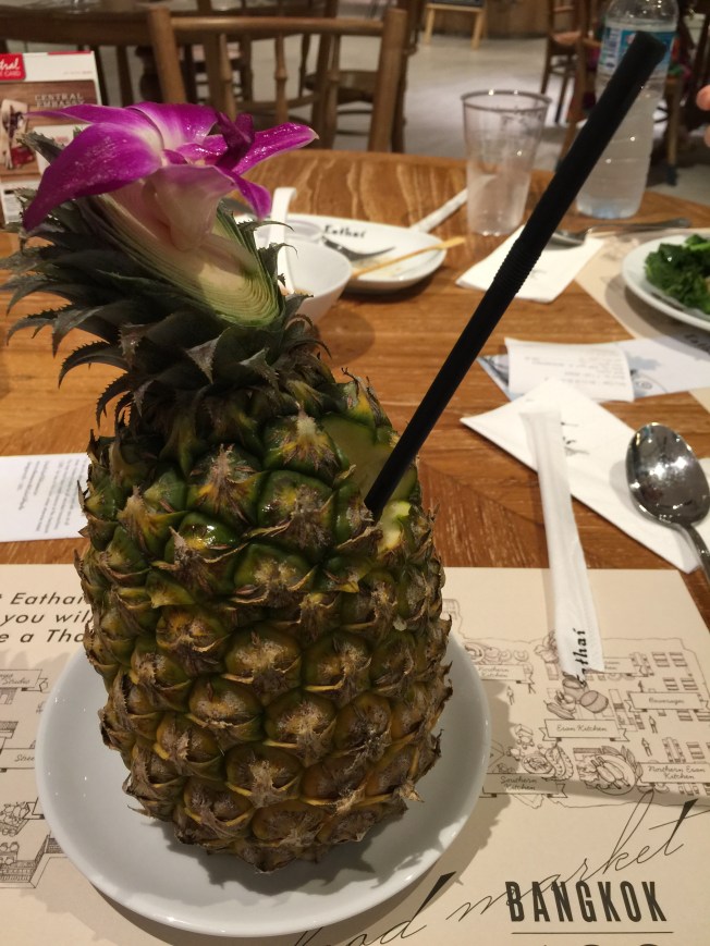 Mom watched the kids and packed while Chris and I walked a km to a mall that had a special food court which include street food. We had avoided street food the rest of the trip because of health concerns so this was a way to test out some famous Thai dishes. They were delicious! Photography was not allowed but I did sneak one picture of this pineapple drink. This was part of Chris’s only glimpse of the city, when he’s there to work he really works. He probably put in 10-15 hours of overtime, plus the travel time was a full 50 hour work week. I really wish he’d been able to get out more but I know he was happy with his conference.